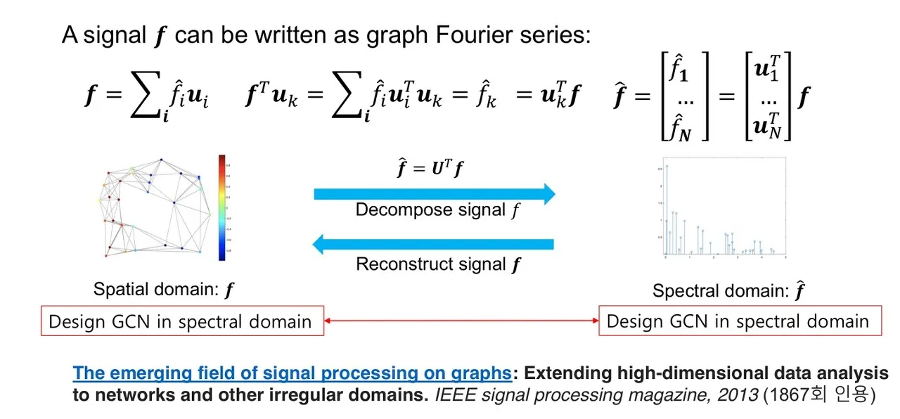 이때, graph signal의 푸리에 변환은 graph의 Laplacian matrix를 eigen-decomposition하는 것과 같음