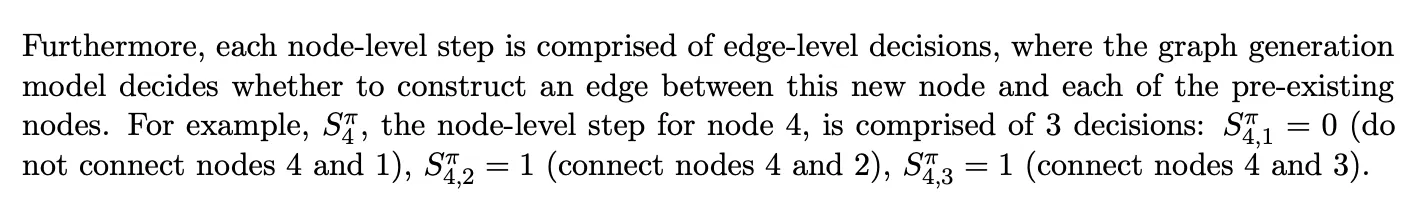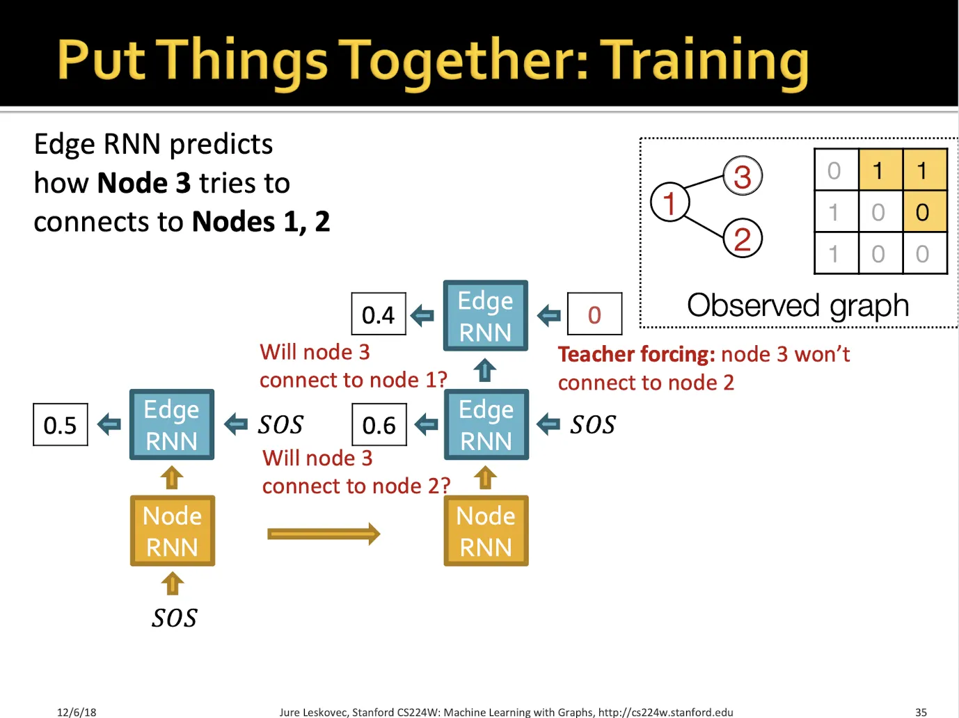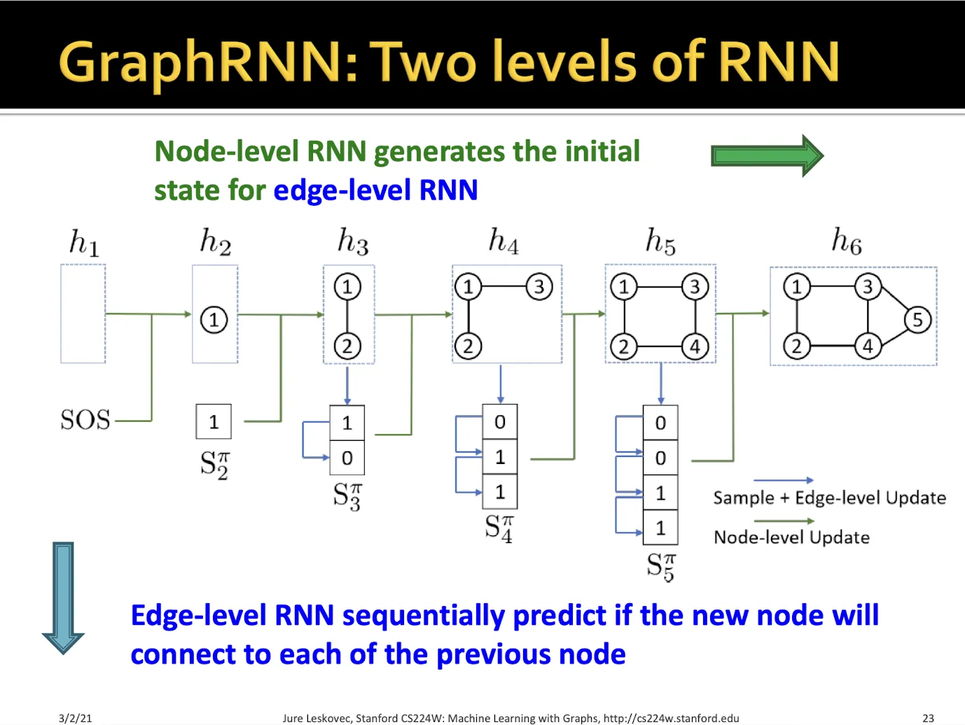 Graph generation은 node-level RNN과 edge-level RNN이 필요하다. Node-level RNN은 해당 node가 존재하는지 여부를 예측하여 edge-level RNN에 initial state를 넘겨 준다.