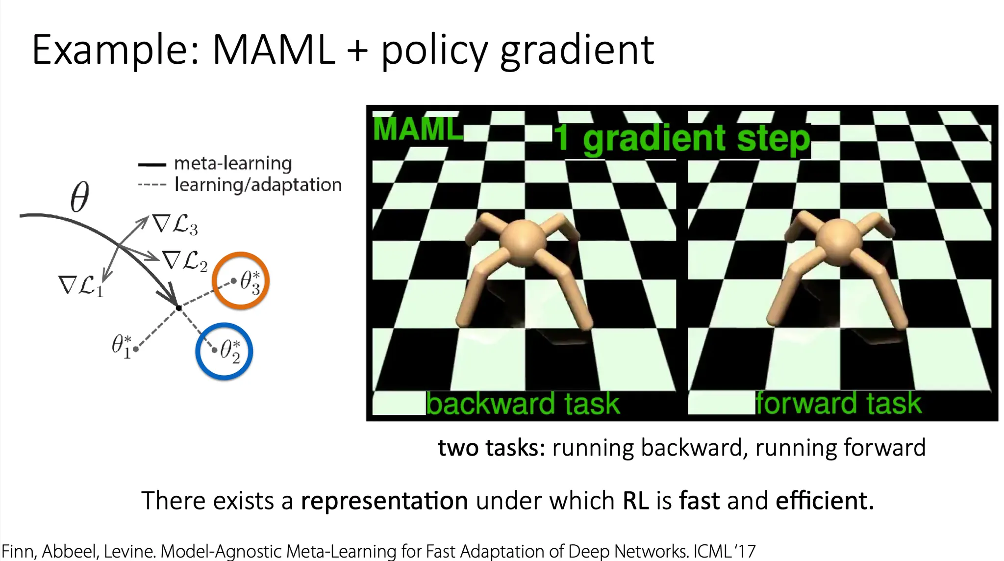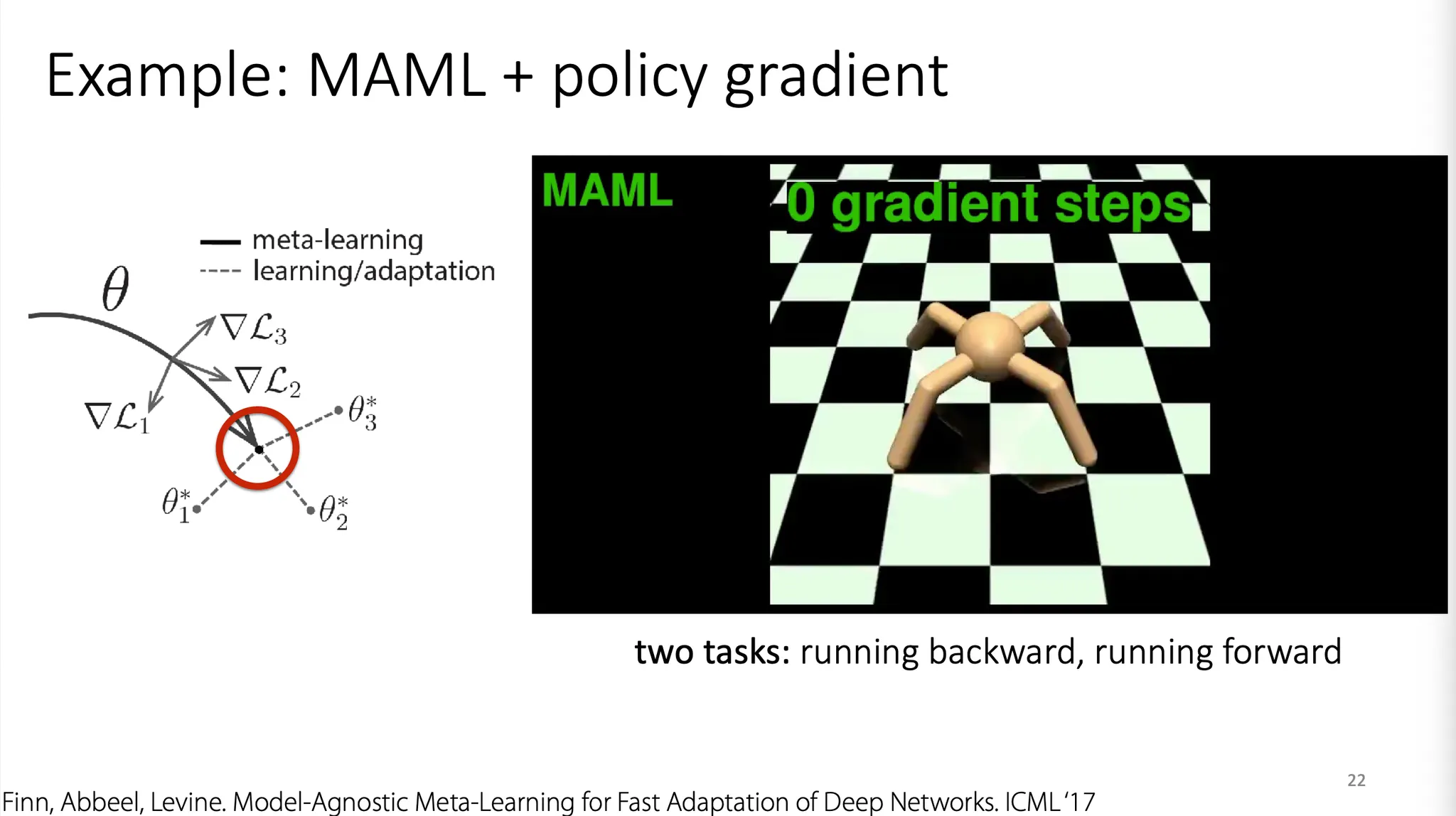 위 예시는 MAML에 policy gradient를 적용한 것으로, 1번의 gradient step만으로도 꽤 괜찮은 성능을 보여주었다. 특정 실험 환경에서는 이렇게 빠르고 효율적인 learning이 가능한 경우가 있다.