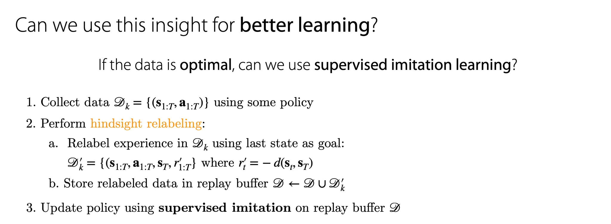 우리가 도달하고자 하는 최종 state를 goal로 두고, policy update는 supervised imitation으로 진행할 수 있다.