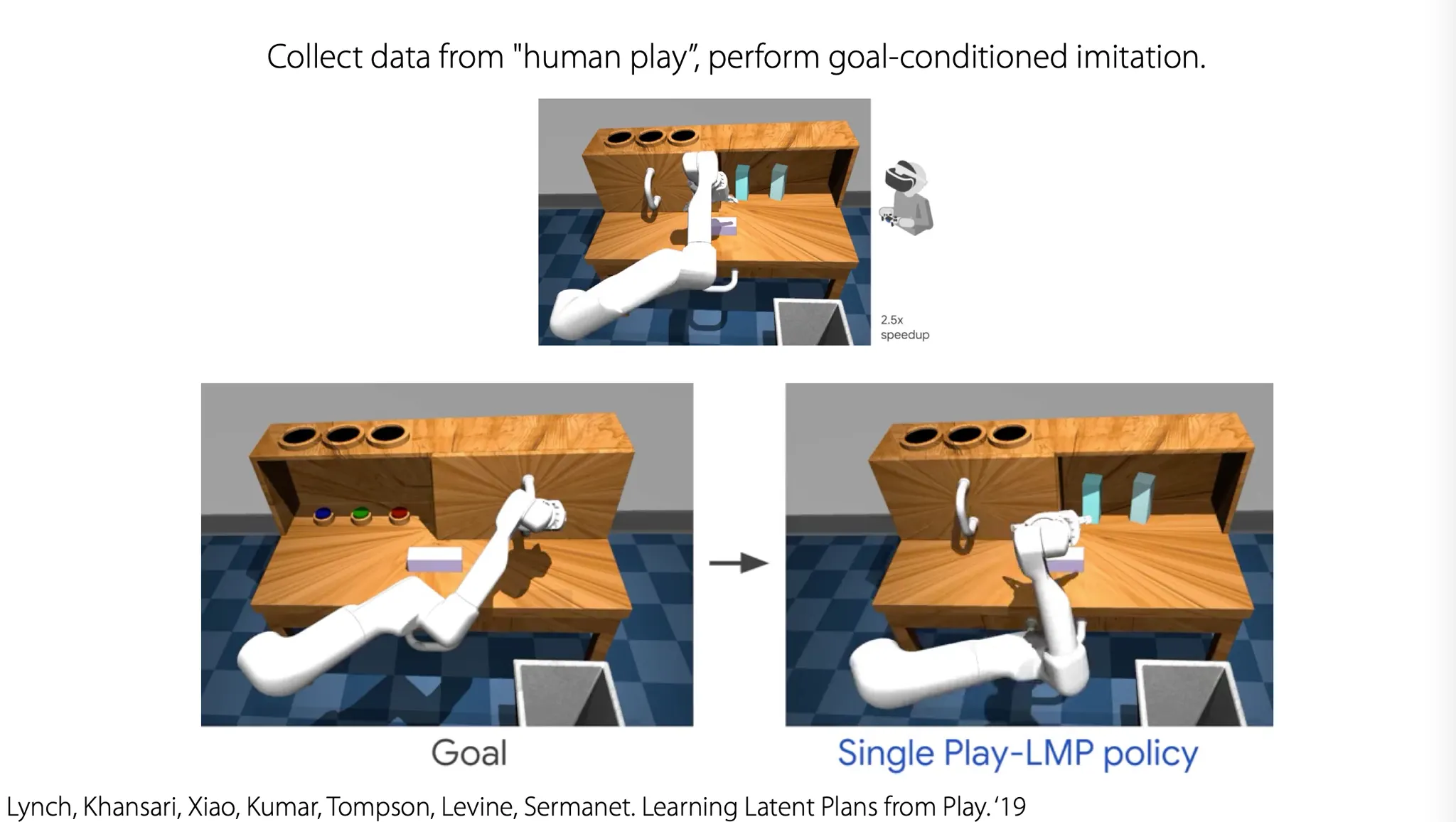 인간이 수행한 데이터 자체를 goal로 삼고, goal-conditioned imitation을 수행하도록 하면 어떤 reward function이 없더라도 학습이 진행된다.