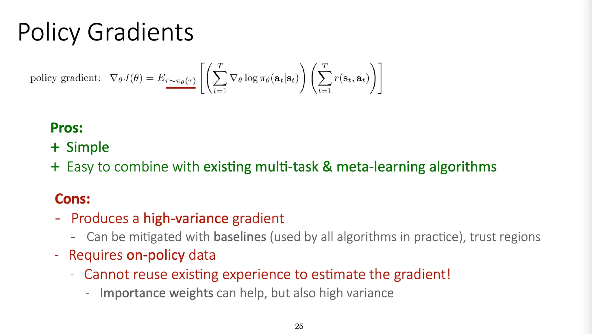 즉, off-policy가 아니라서 gradient estimate로 기존에 다른 task에서 학습했던 경험을 사용할 수 없다. 현재 policy를 update하려면 현재 policy에서 볼 수 있는 data만 사용할 수 있다. 따라서 sample inefficient 하다.
