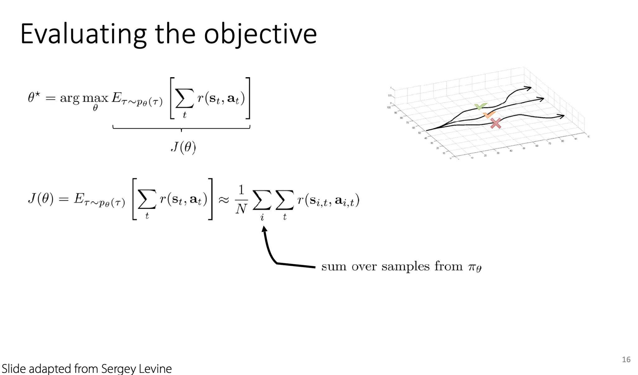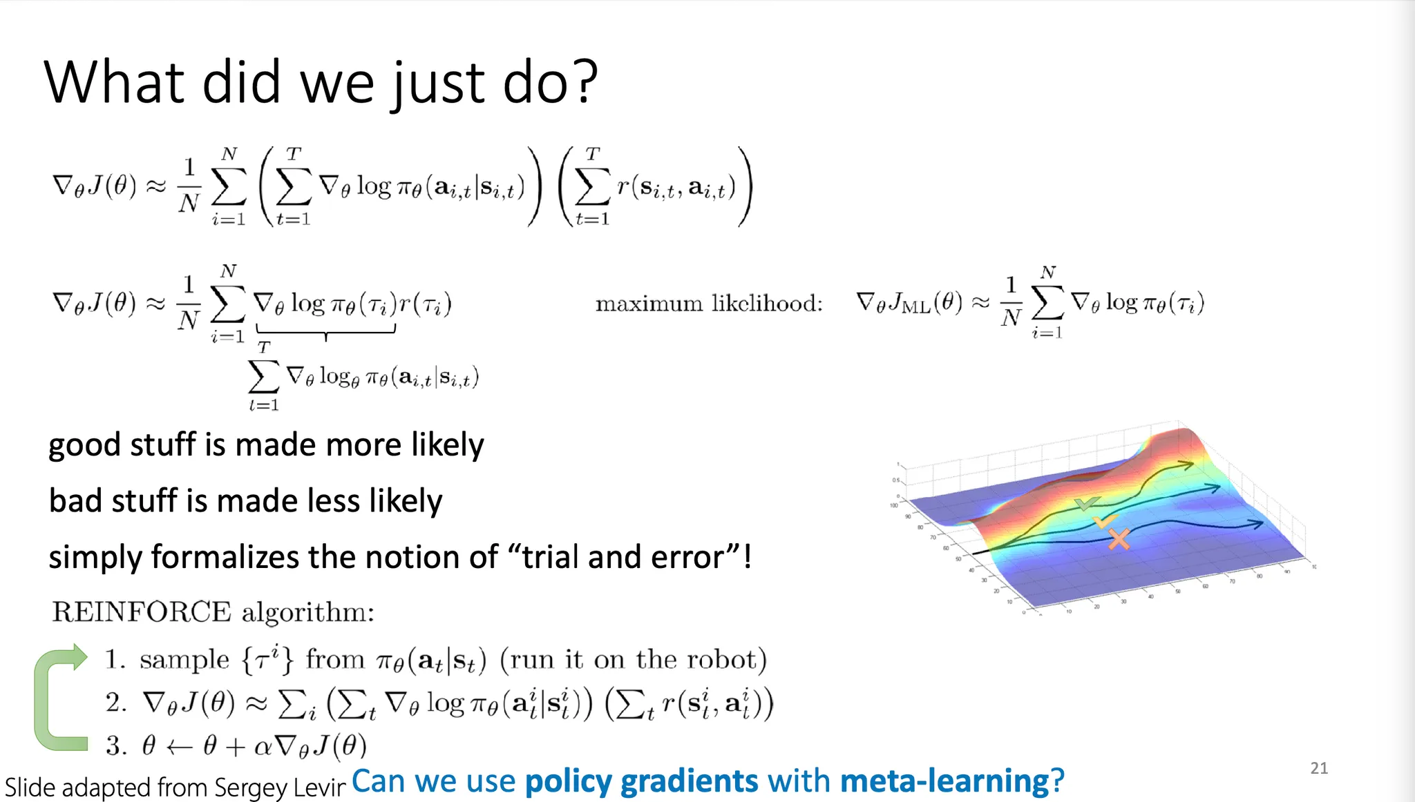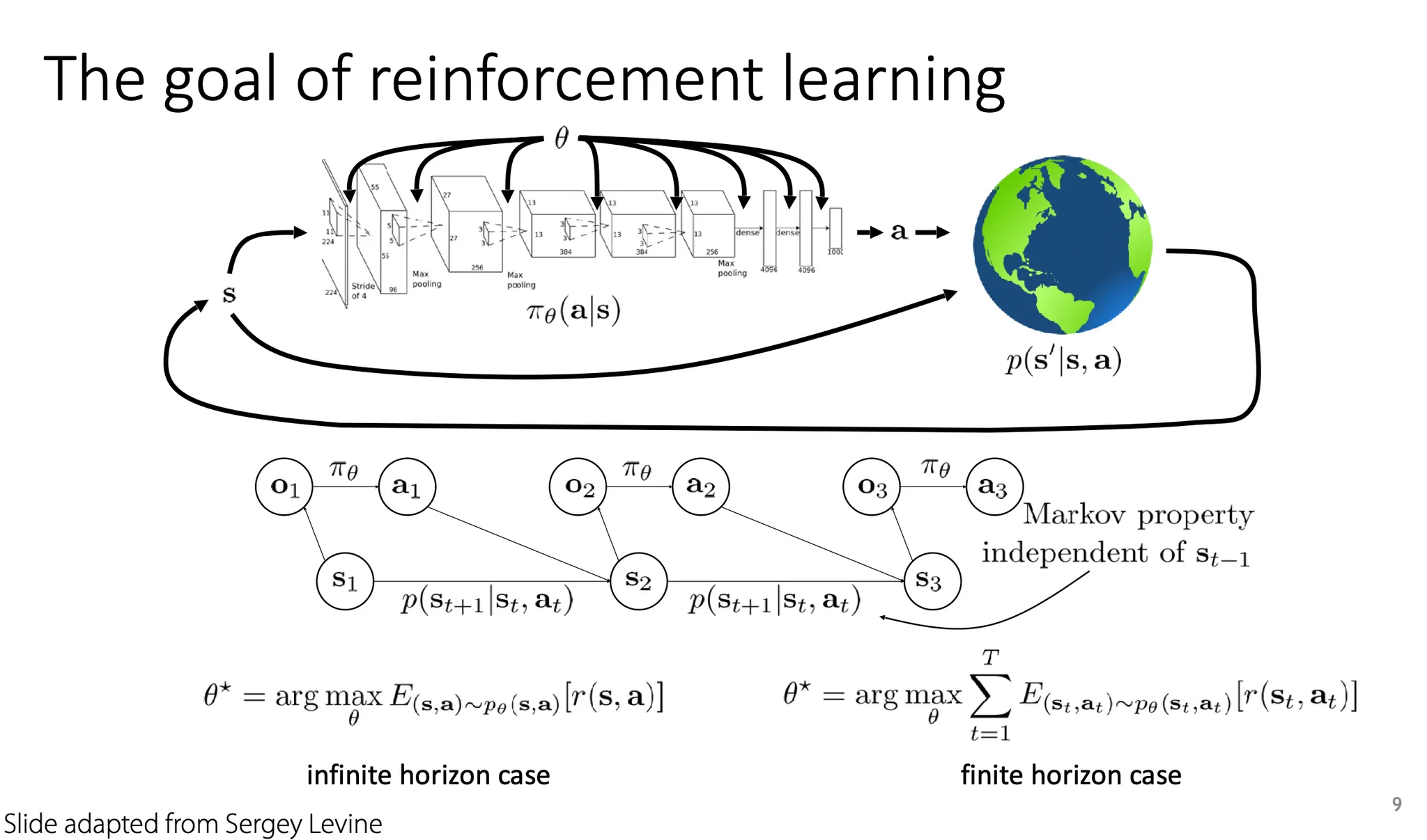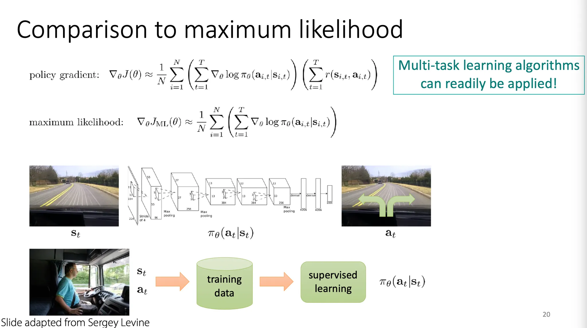 Expert action을 imitation하는 maximum likelihood 와 어떤 점이 다를까? 다른 점은 reward term 뿐이다. 즉, RL에서는 결과적으로 reward가 큰 action들의 probability를 높게 설정하게 된다.