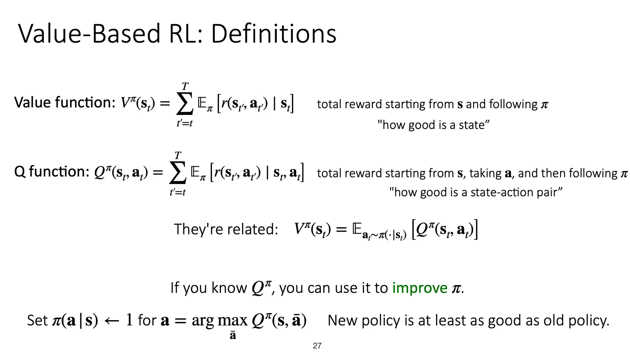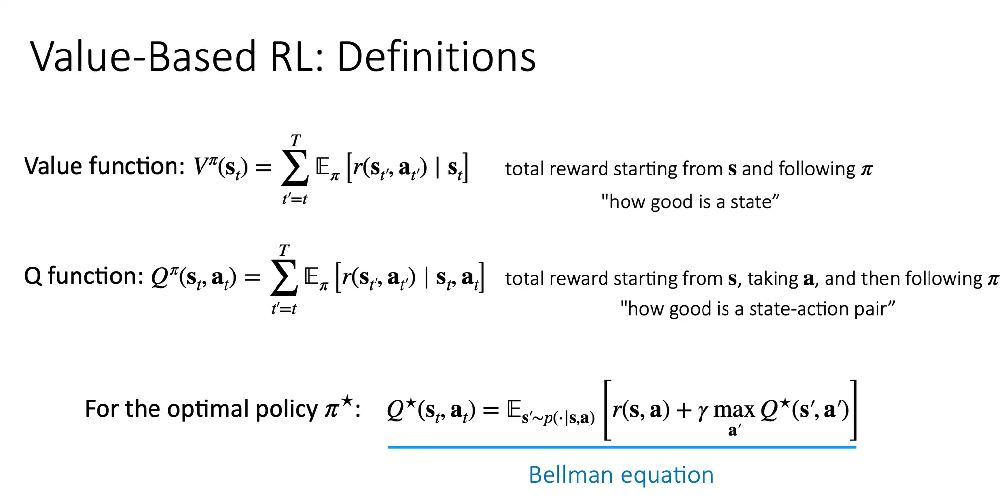 Q-learning에서 value function은 특정 state에서 시작하여 time step마다 다른 state로 바뀌는 것이 얼마나 좋은지를 알려주는 함수이다. Q function은 특정 state에서 시작하여 어떤 action을 선택하는 것이 얼마나 좋은지를 알려주는 함수다.