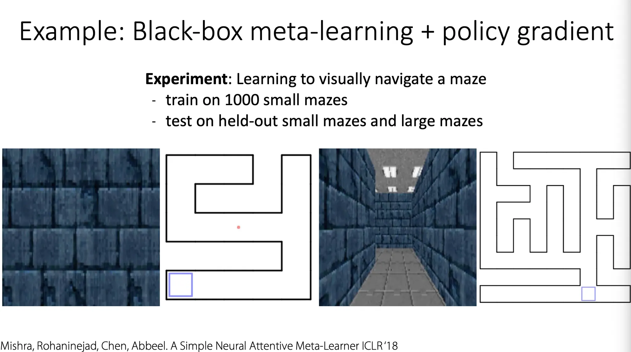 Black-box meta-learning의 경우에는 어떨까? 이 경우도 마찬가지이다. 위 예시는 미로를 푸는 meta-learner의 학습에 policy gradient를 적용했다.