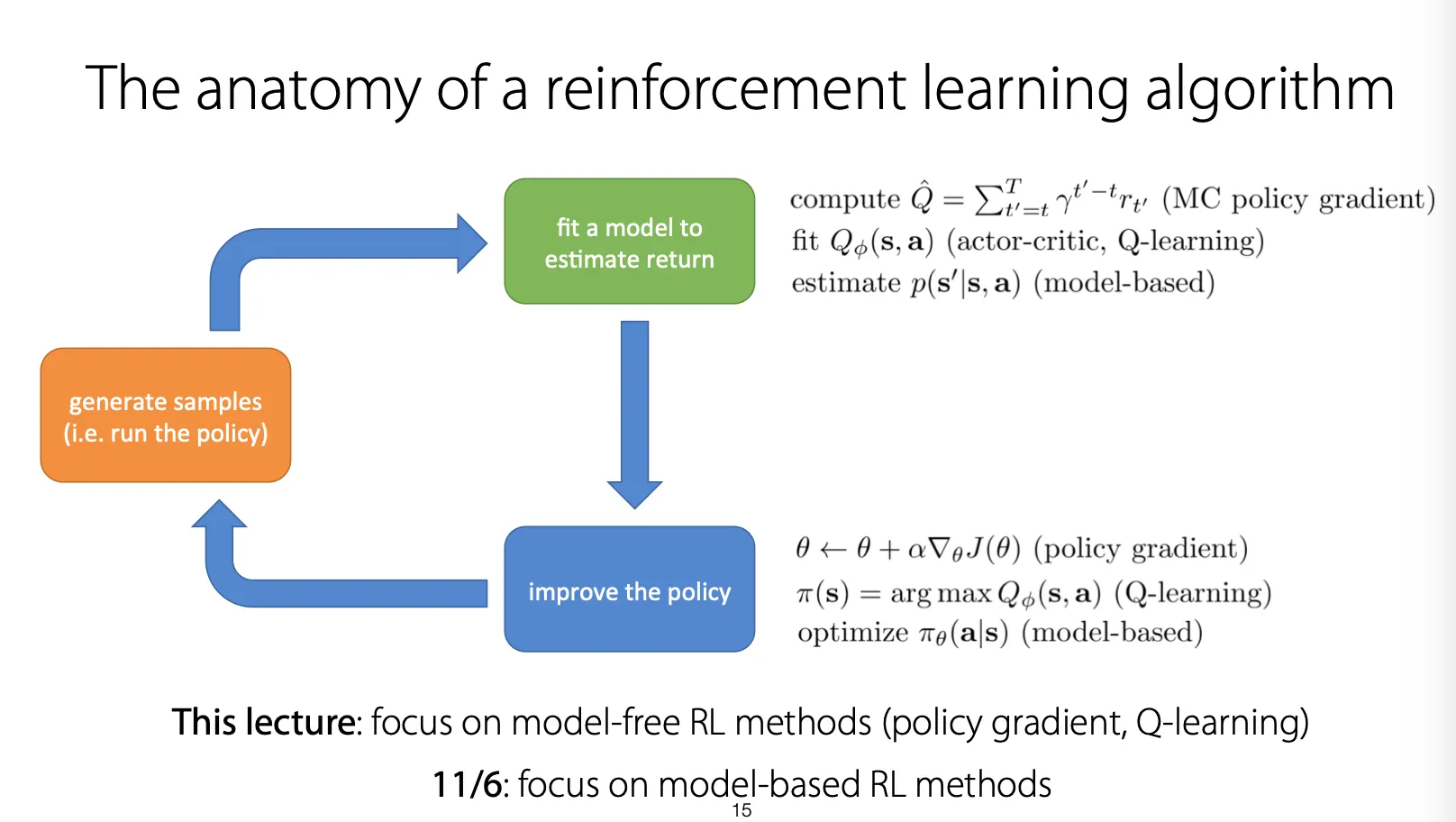 RL algorithm을 분석해보면, policy를 실행해서 sample들을 generate하고, 그 sample들에 대해 model을 fit해서 return을 예측해낸 뒤, 그를 바탕으로 policy를 update하고 다시 sample을 generate하는 구조로 흘러간다. 크게 policy gradient, Q-learning, model-based로 나눌 수 있고, 이번 강좌에서는 policy gradient, Q-learning 관점에서의 RL method들을 주로 다룬다.