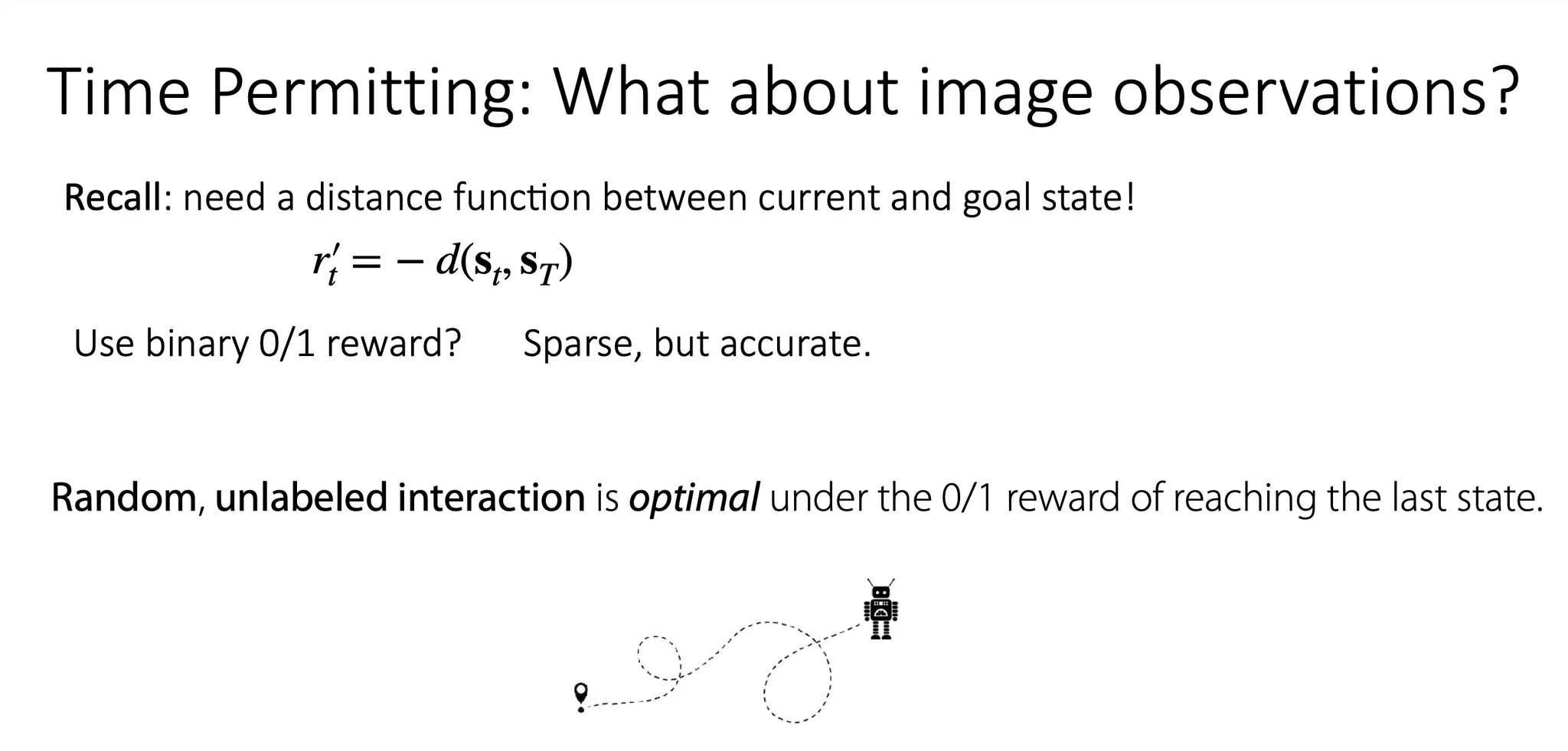 Binary reward를 사용하면, 최종으로 우리가 원하는 state에 도달하는 task에서 agent가 random 하고 unlabel된 interaction을 수행하는 것이 optimal 한 action이 된다. 이 때는 중간 과정이 어떻게 되었든지 상관이 없다.