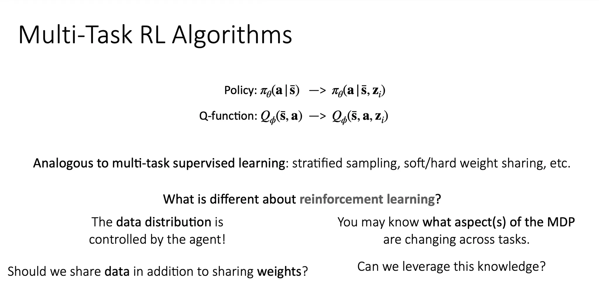 Multi-task learning에 RL을 어떻게 적용할 수 있을까? Policy와 Q-function에 task identifier 를 추가해주면 된다. Multi-task supervised learning에서 stratified sampling이나 weight sharing을 하는 것과 비슷하다. 차이점이 있다면 supervised learning과 달리 data distribution이 주어지지 않고, agent에 의해 생성되며, task에 따라 MDP의 어떤 특성이 변하는지 알 수 있다는 점이다. 여기서 생각해볼 점은 weight sharing 뿐만 아니라 data sharing도 필요한지, 그리고 MDP의 aspect가 바뀌는 점을 어떻게 이용할 수 있을지이다.
