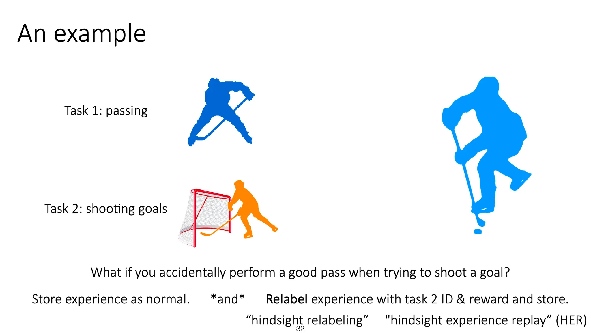 예를 들어, pass를 학습하는 task와 goal shooting을 학습하는 task가 있다고 해보자. 생성된 data가 goal shooting을 목적으로 시도했지만 좋은 pass가 되어버렸다면, 그 data는 저장을 하되, relabeling하여 task 2에서는 bad reward를 부여하고, task 1에서는 good reward를 부여할 수 있을 것이다. 이런 과정을 hindsight relabeling이라고 부른다.