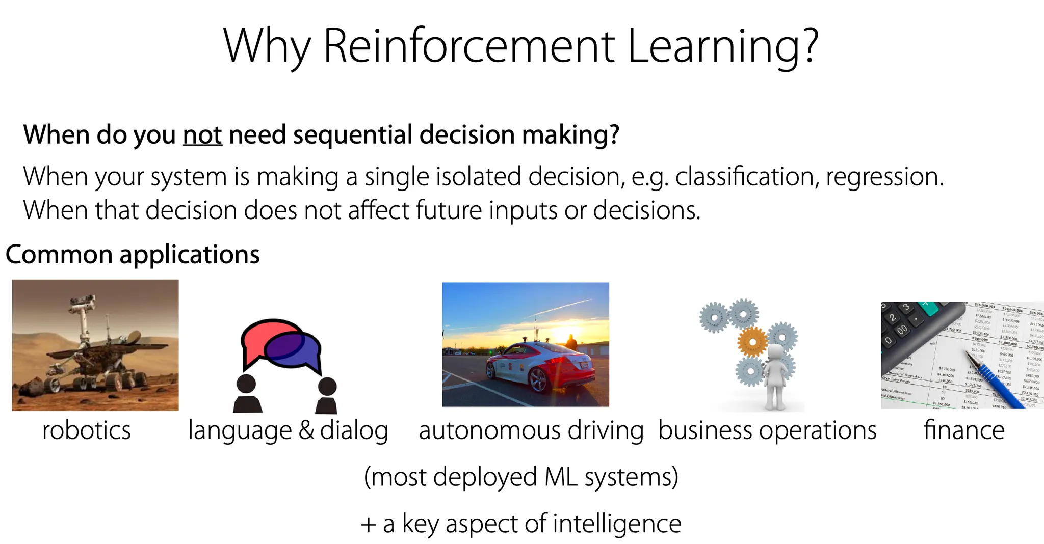 사실 많은 task가 sequential decision making이 필요하다. 그렇지 않은 것들의 예시는 단순한 classification, regression 등이 있다. 이외에 robotics, language, autonomous driving 등에서는 순차적인 결정이 최종 결과에 큰 영향을 미친다.