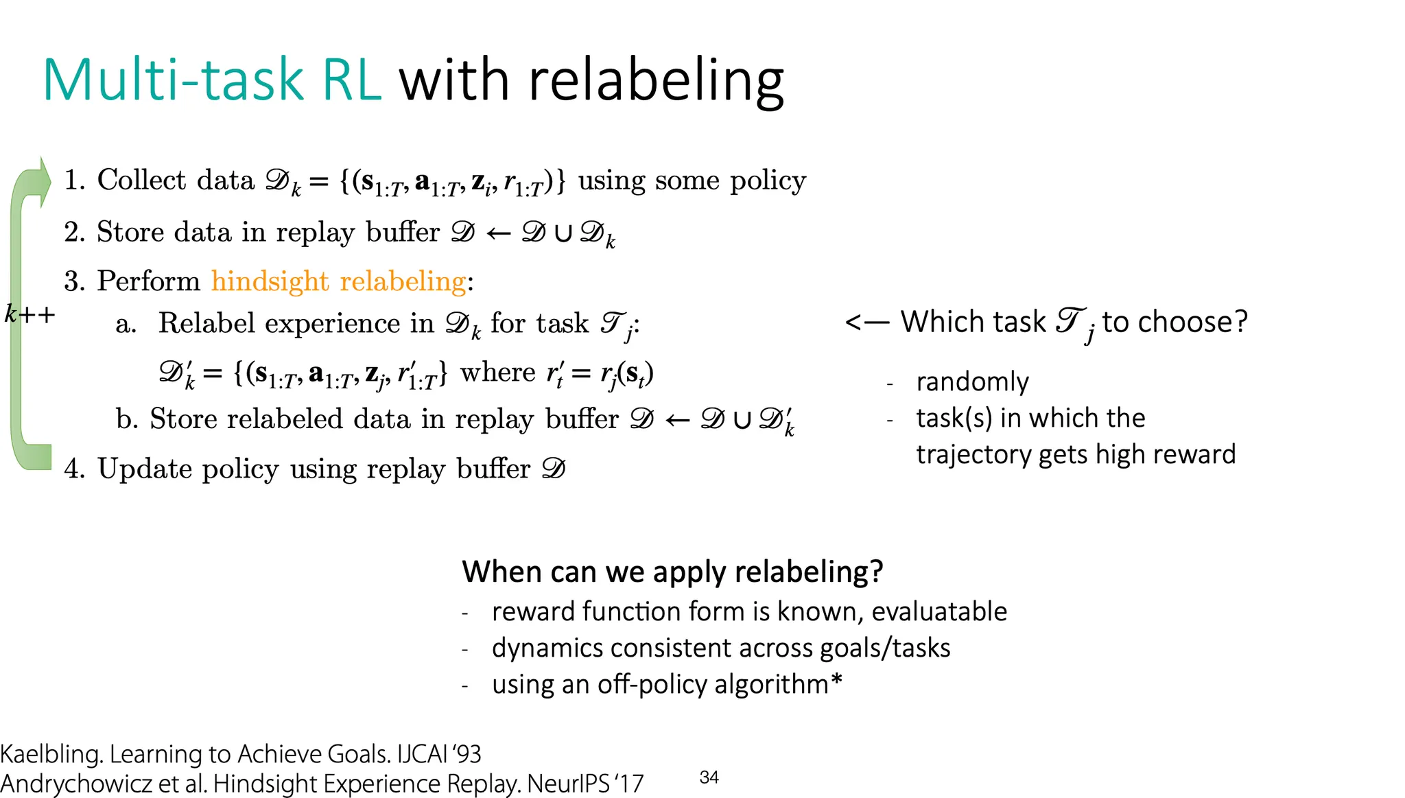 Multi-task RL 상황도 Goal-conditioned RL과 비슷하게 학습할 수 있다. 차이점은 goal state를 따로 두는 것이 아니라, task identifier를 바꿔서 relabeling 하는 것이다.
