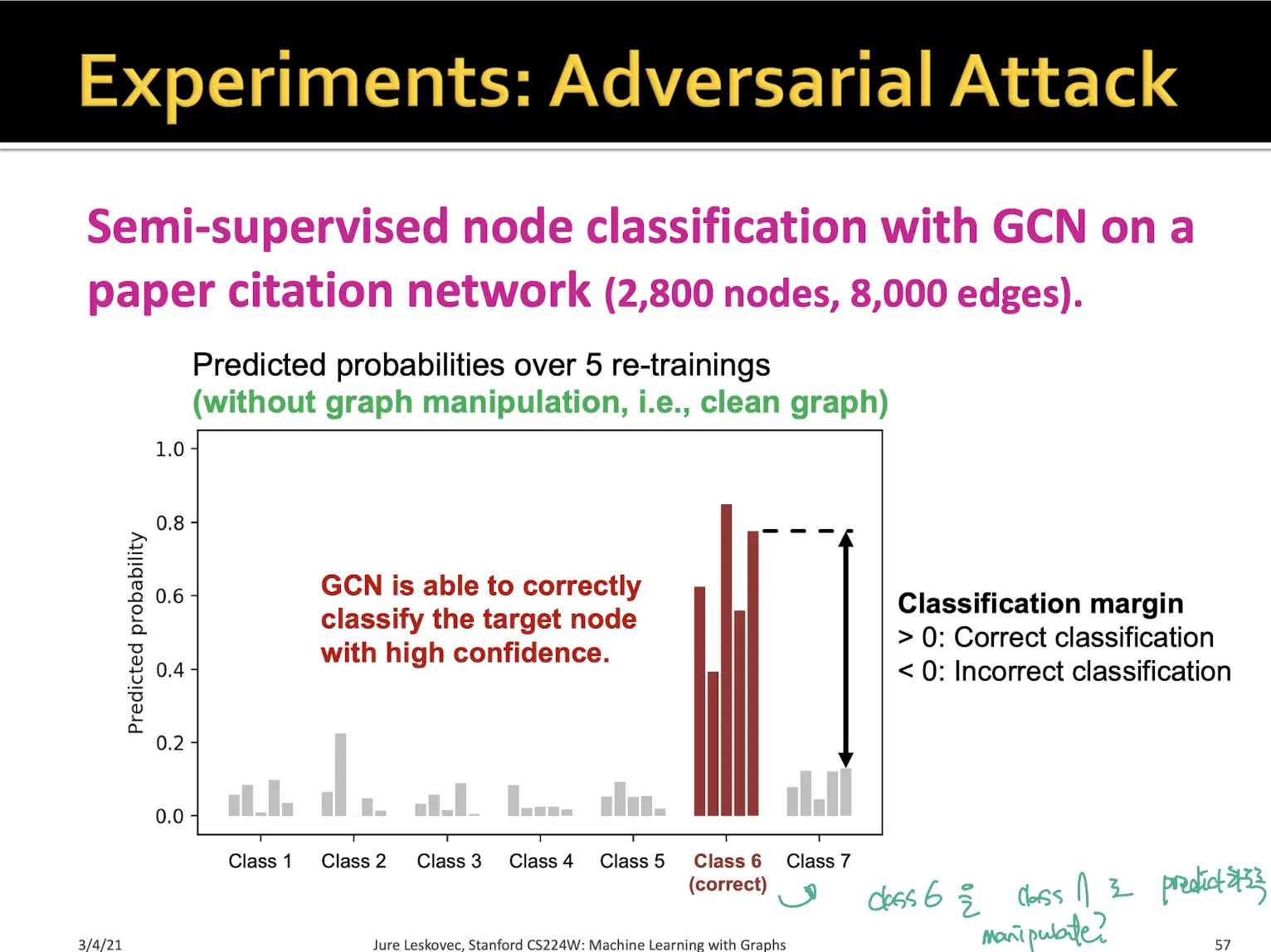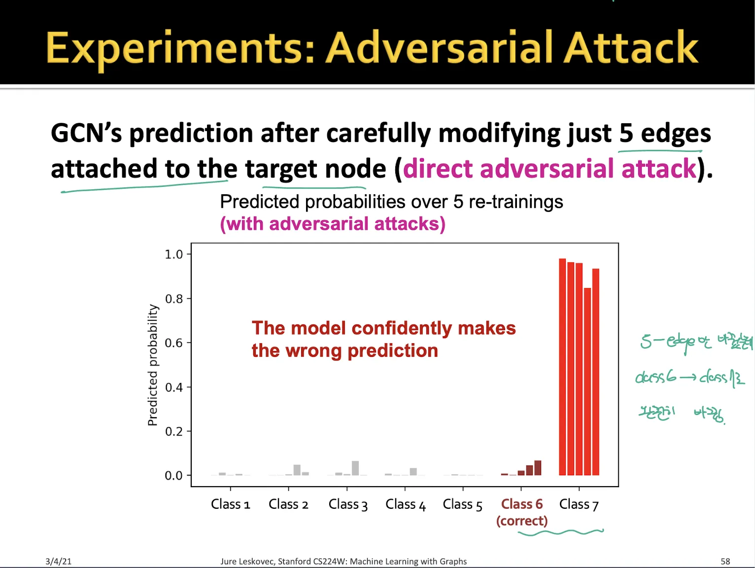 2800 개의 node, 8000의 edge가 있는 graph에서 target node와 붙어있는 5개의 edge를 바꿨더니 예측하는 class가 완전히 달라짐