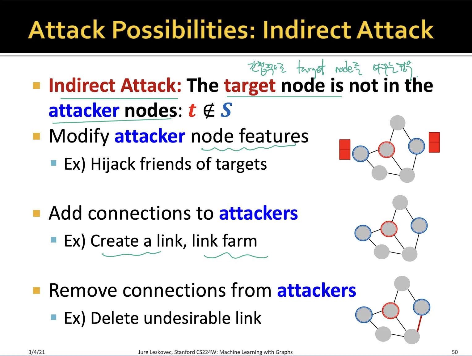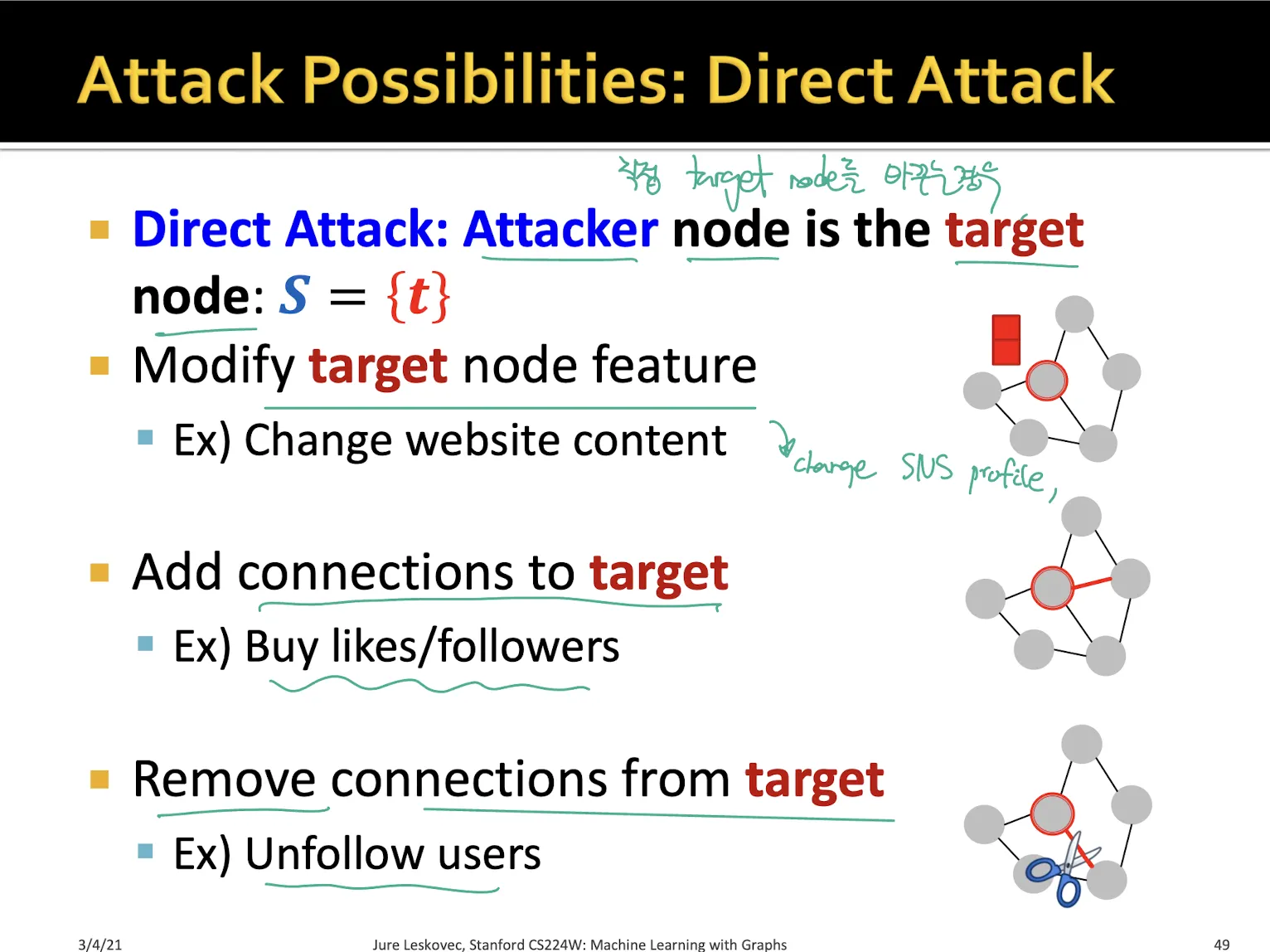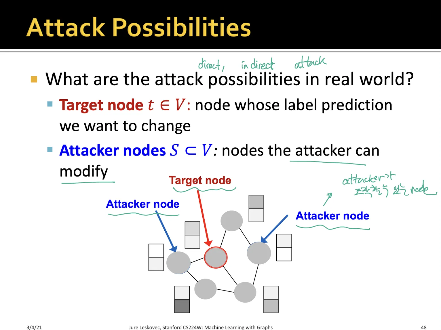 Attack의 종류에는 attacker가 target node를 직접 조작할 수 있는 direct attack과 간접적으로 node, edge등을 조작하는 indirect attack이 있다.