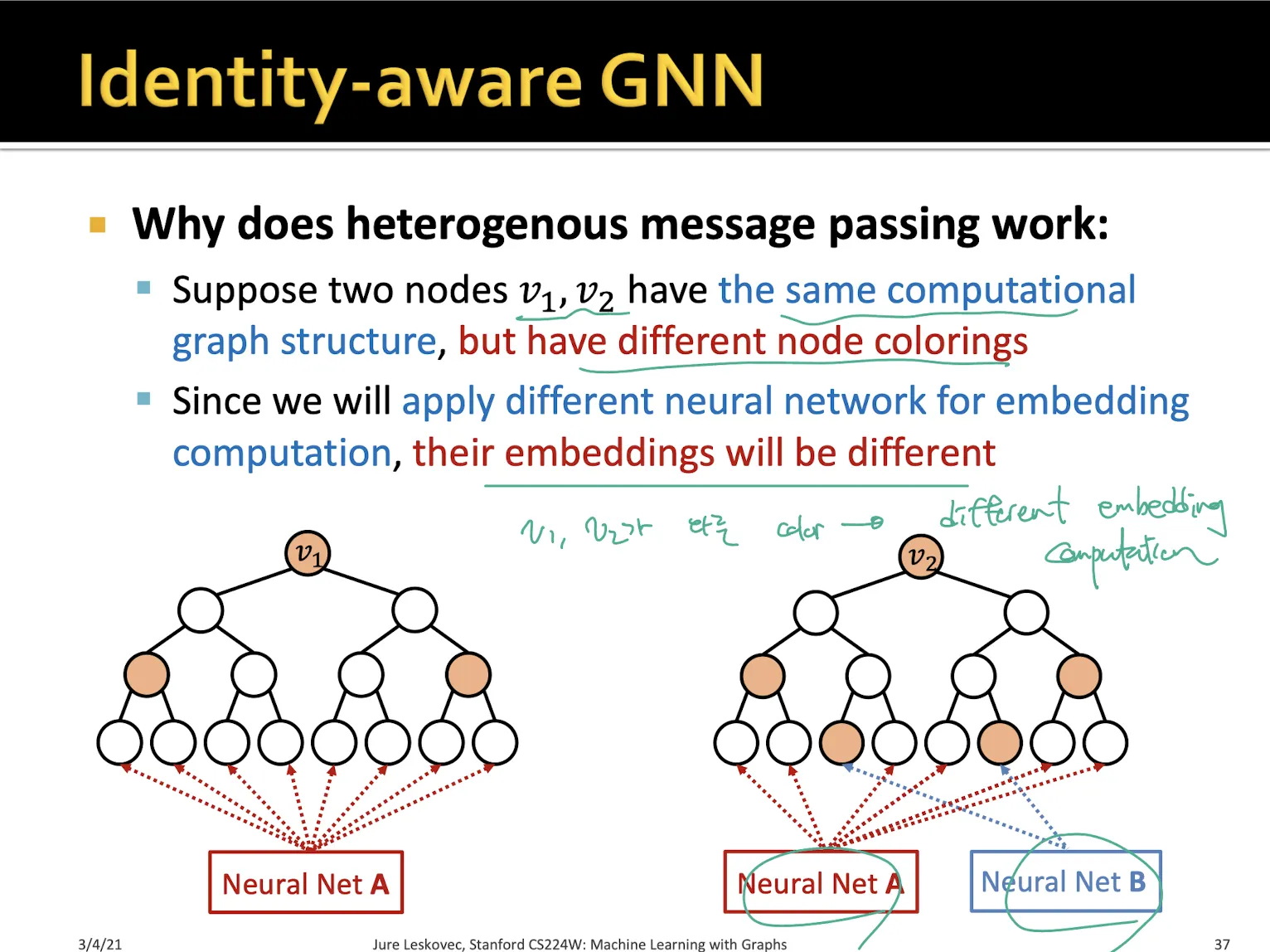 다른 종류 (color)의 node에 대해서 다른 network로 aggregate 한다면 computation graph가 같아도 다른 embedding을 만들어낼 수 있을 것이다.