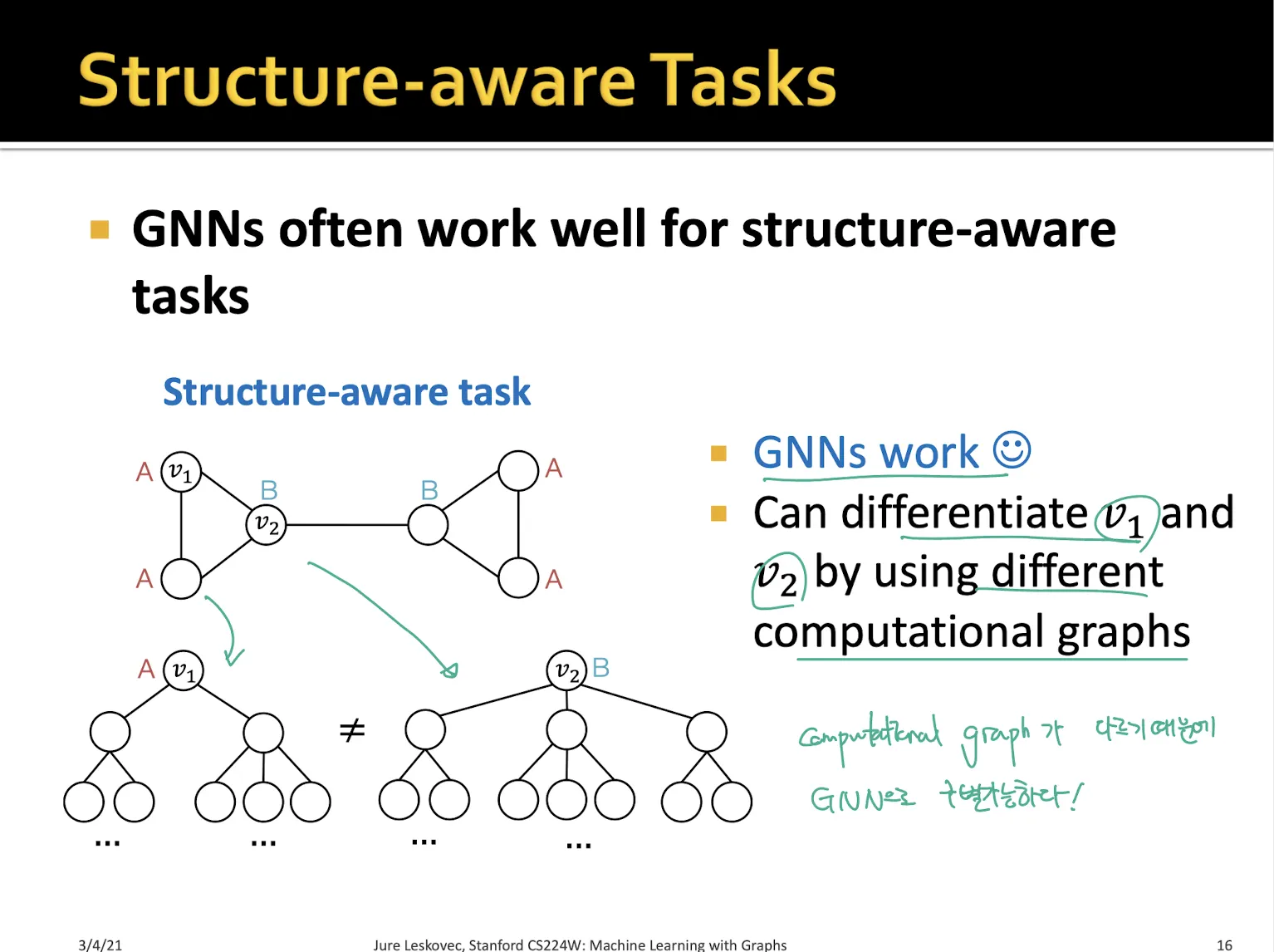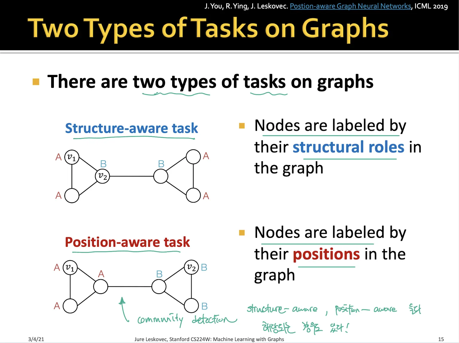 Structure-aware 와 position-aware task 로 두가지 GNN 종류가 있다.