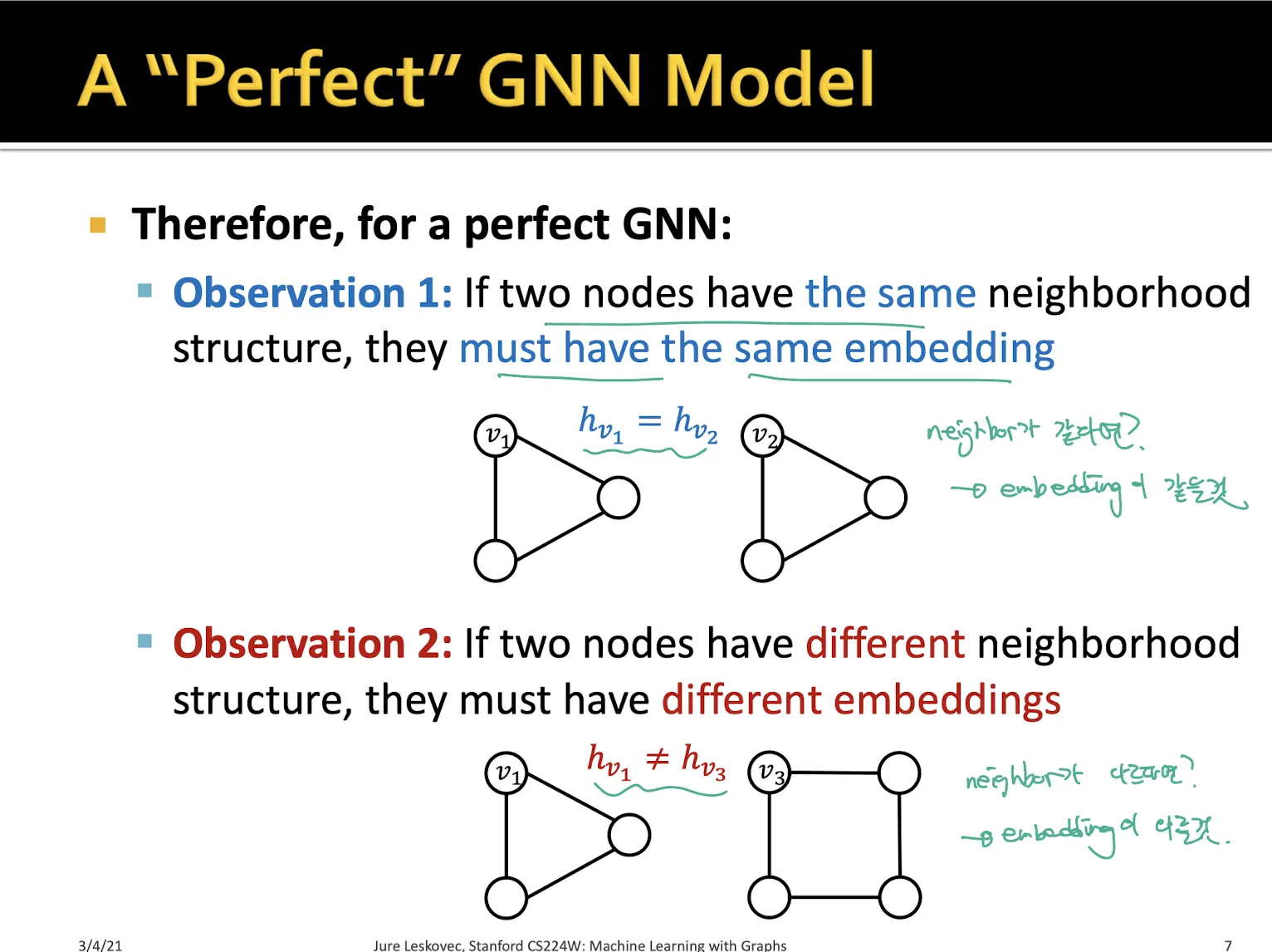 Perfect GNN model 이란 같은 neighbor를 가지는 node는 같은 embedding을가지고, 다른 neighbor를 가지는 node는 다른 embedding을 가지는 것이다.