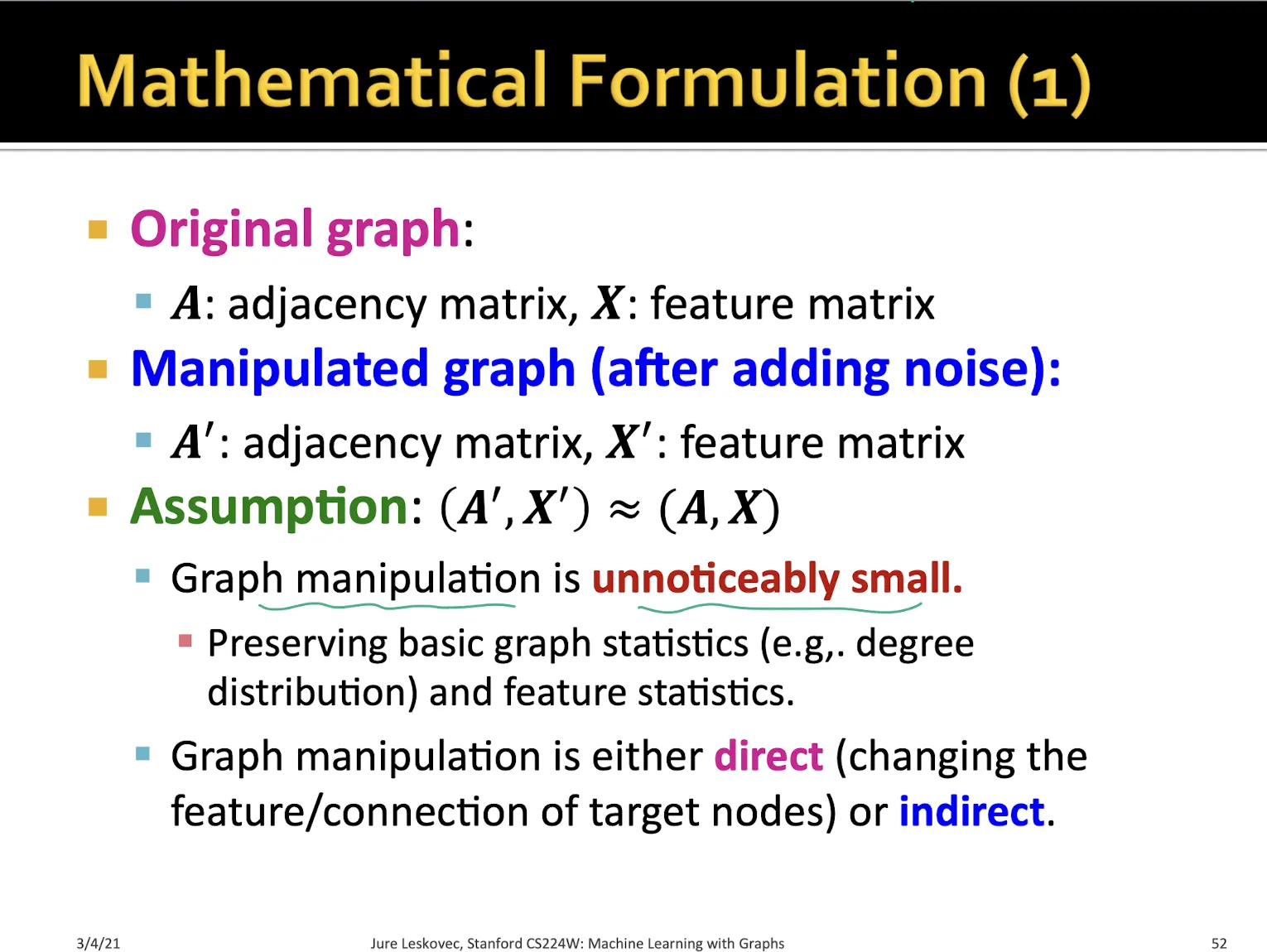원래 graph에서 adjacency matrix나 feature matrix에서 조금만 조작을 가한다.