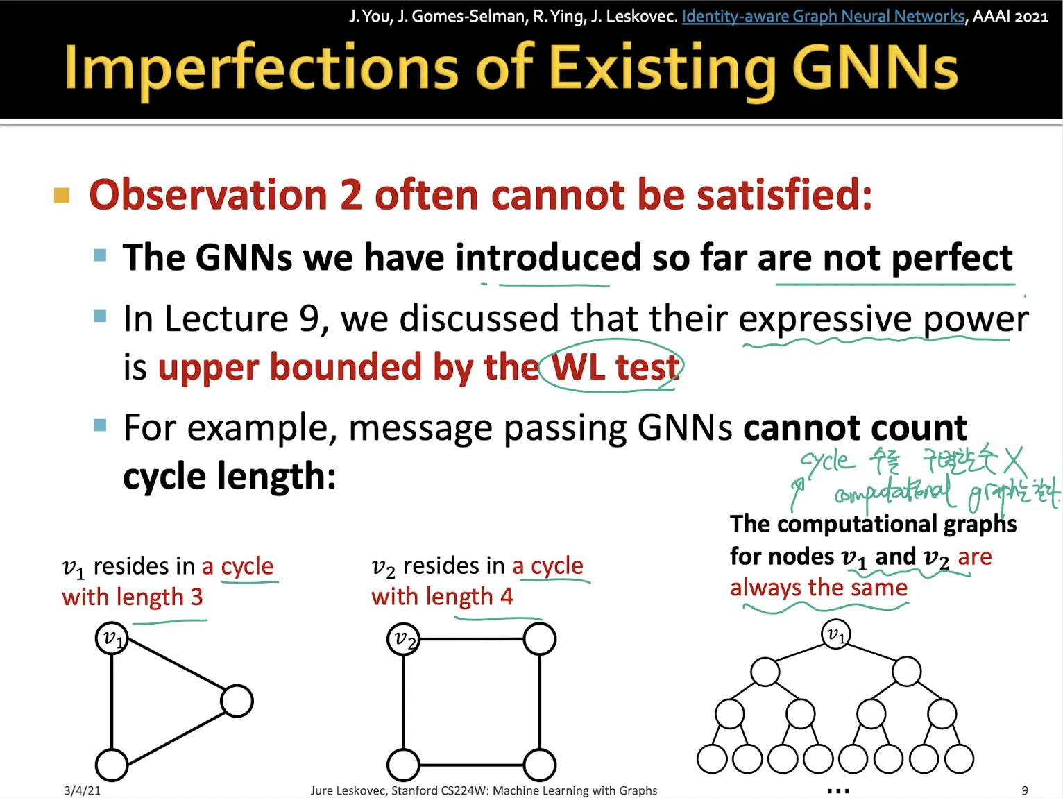 다른 neighbor를 가지지만 computational graph가 같은 경우 같은 embedding으로 잡히기 때문에 문제가 생김 (v1, v2 둘다 neighbor가 2개, 하위 노드도 neighbor가 2개 여서 computational graph가 같다고 말한다고 이해함)