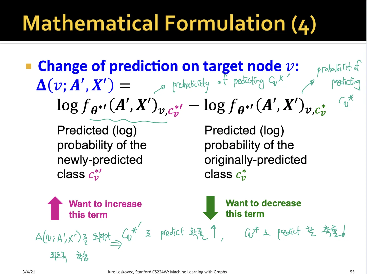 target node에 대한 class prediction 과 graph manipulate 이후 target node에 대한 class prediction이 다르면 된다.