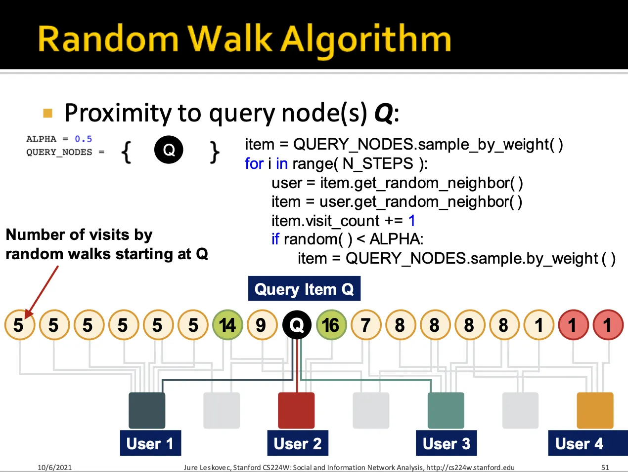 이를 통해 각 item node에 대해서 방문 횟수를 구하게 되면 Query node Q와 가장 비슷한 item을 찾을 수 있습니다.