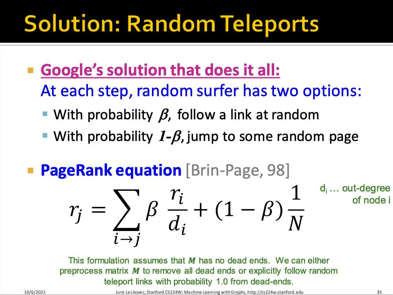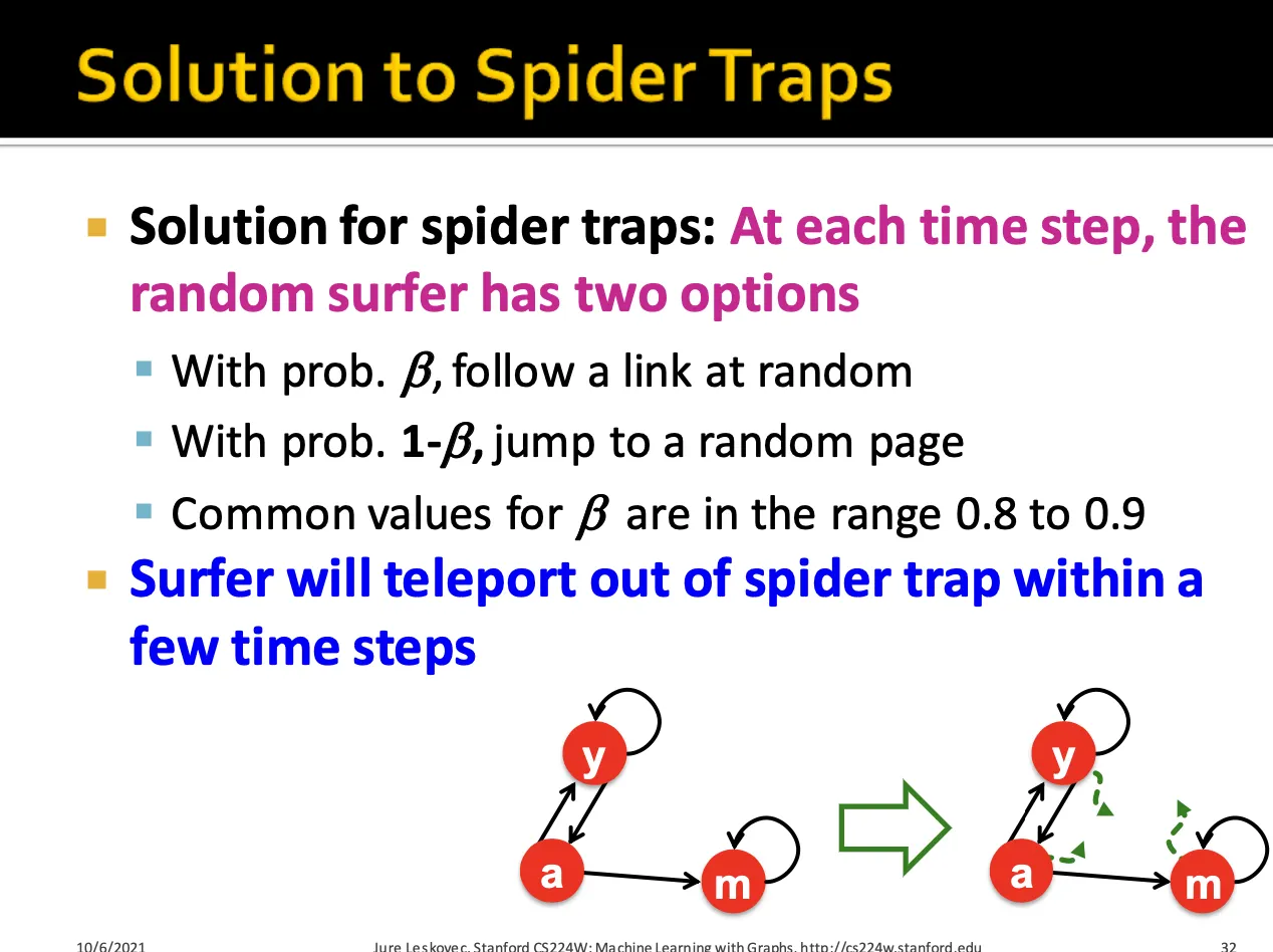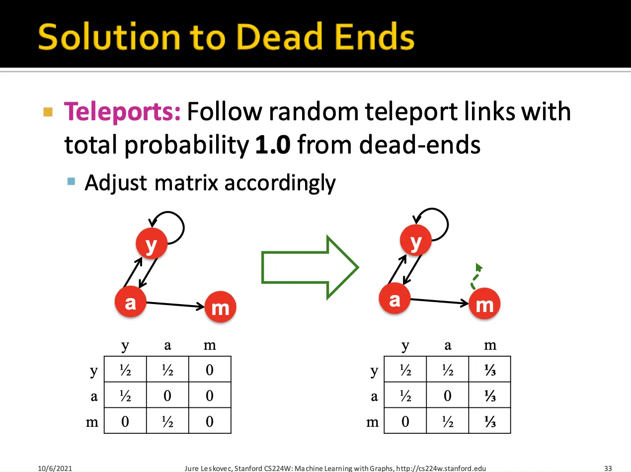 Dead Ends에 대한 해결방법으로는 dead-ends에 도달했을 때 일정 확률을 통해 다른 node로 teleport 할 수 있게 하는 것입니다.