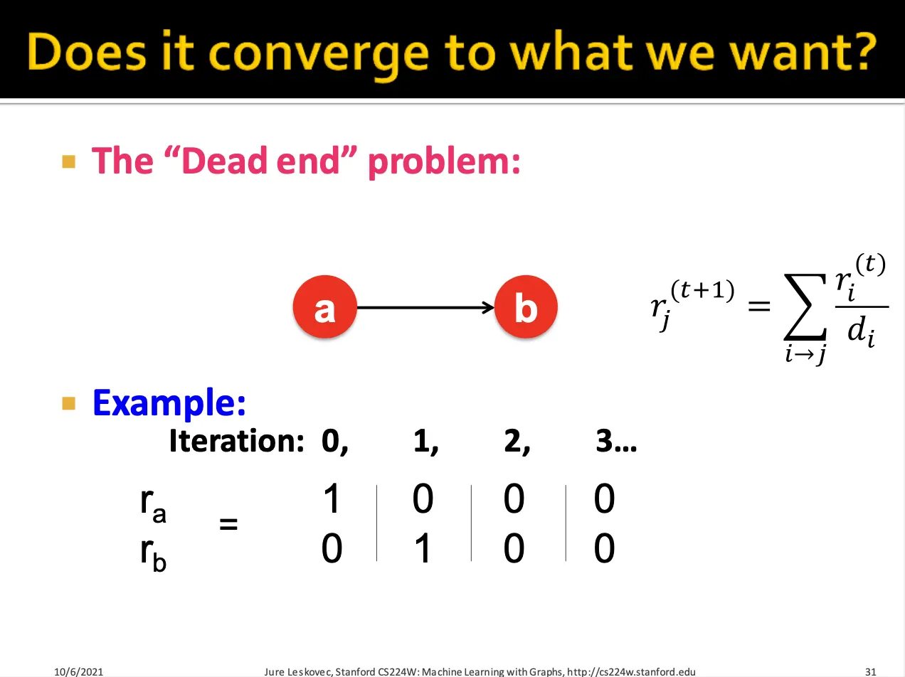 Dead end의 경우 out-link가 없는 node에 대해서 iteration을 반복하면 rank가 0으로 수렴할 수 있습니다.