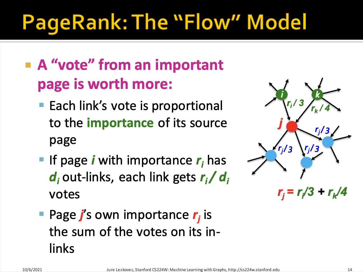PageRank는 각각의 source node들의 rank(importance) 를 out-link 의 개수에 나눈 값들을 link의 rank로 두고, target node에 대해서는 이 rank들을 더합니다.