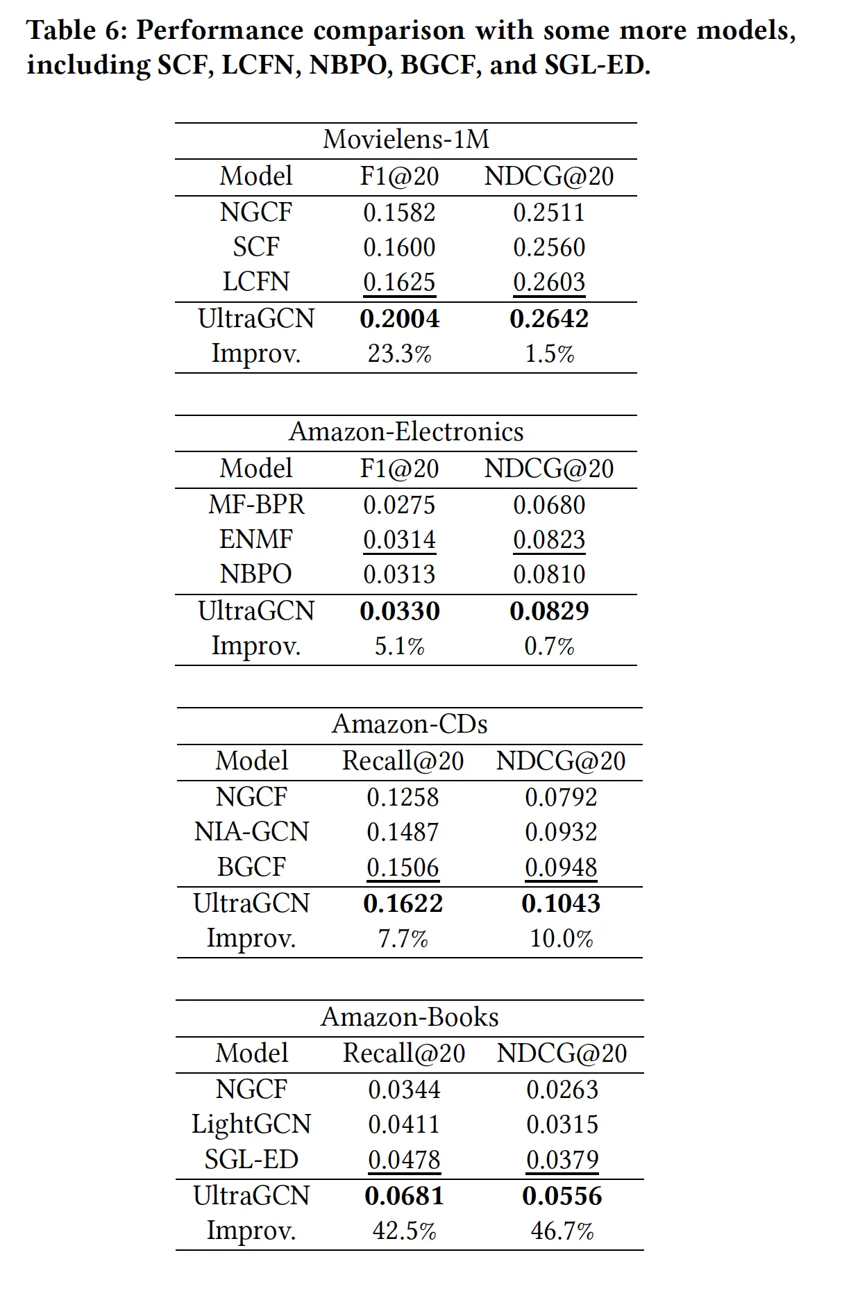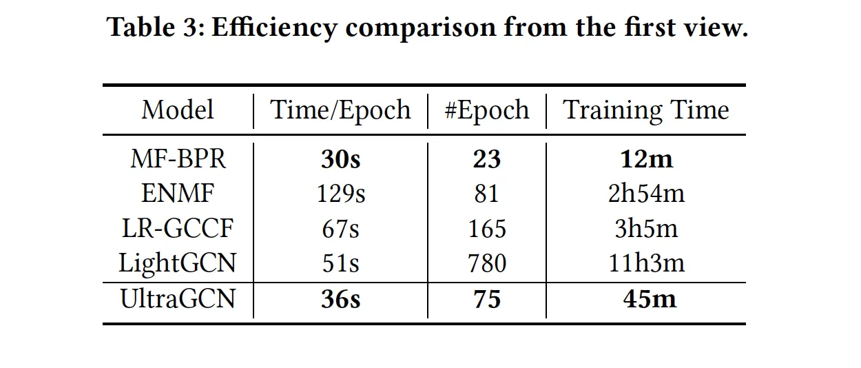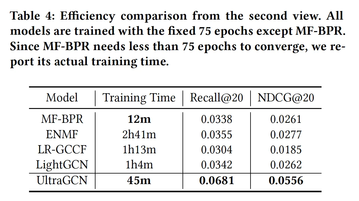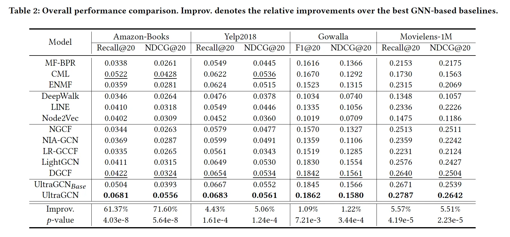 네 개의 데이터셋에서 일관적으로 UltraGCN이 다른 모델보다 우수한 성능을 보임. 왜일까?