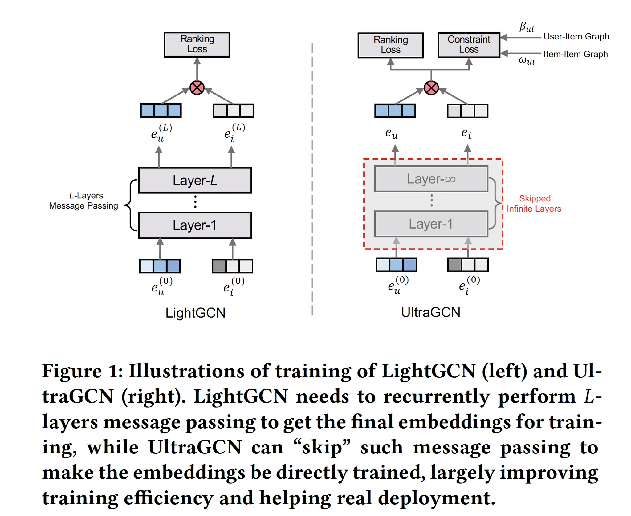 Instead of explicit message passing, UltraGCN resorts to directly approximate the limit of infinite-layer graph convolutions via a constraint loss.