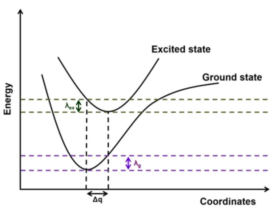 3D ์ขํ๋ ๋ค๋ฌ ์ํ(excited state)์ ๋ฐ๋ฅ ์ํ(ground state) ๋ ๊ฐ์ง๊ฐ ์ฃผ์ด์ก๊ณ , reorganization energy () ๋ ๊ฐ์ง๊ฐ label๋ก ์ฃผ์ด์ก์ต๋๋ค.