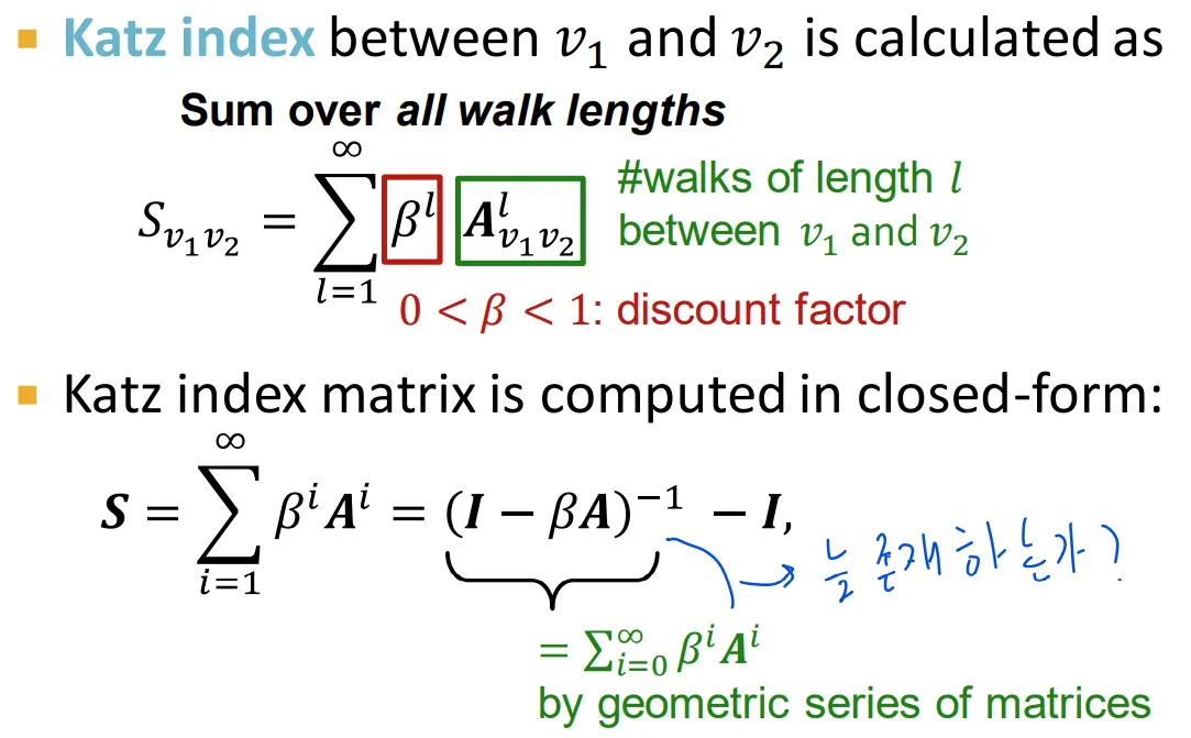 Katz index 활용. 두 node 사이의 가능한 walks 조합을 파악
