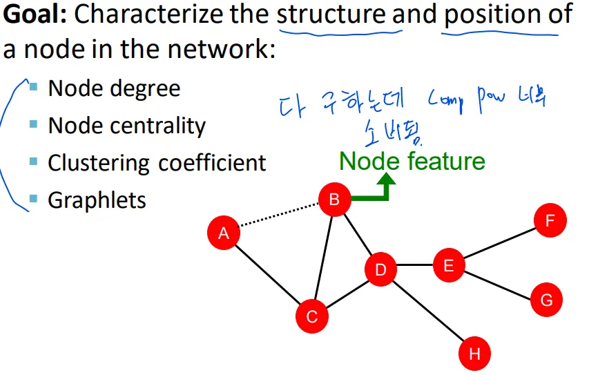 Node-level의 feature를 얻으려 함. 간단하게 보면 node degree도 feature로 볼 수 있음