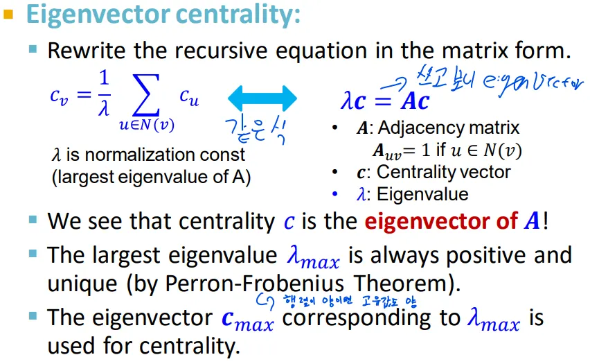 Eigenvector centrality는 내 주위에 중요한 node가 있으면 나도 중요하다는 뜻