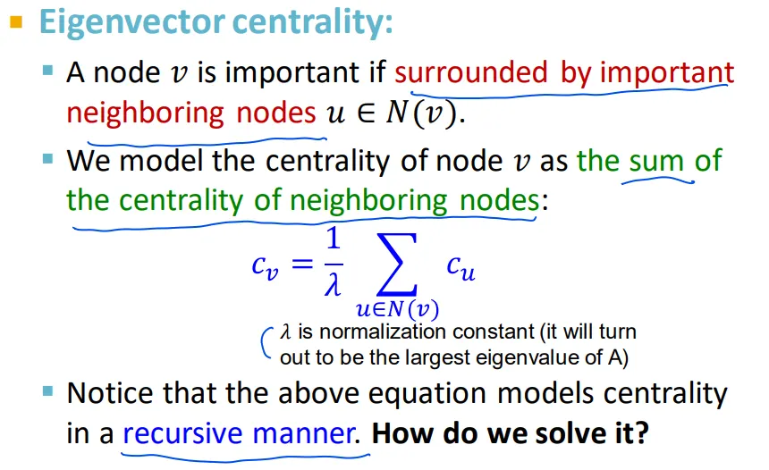 내 중요도가 이웃들의 중요도에도 영향을 미치기 때문에 recursive하게 구할 수도 있고, 식 형태를 행렬로 표현하면 그게 eigen vector를 구하는 거랑 같아서 eigen vector 구하는 문제로 바꿀수도 있음