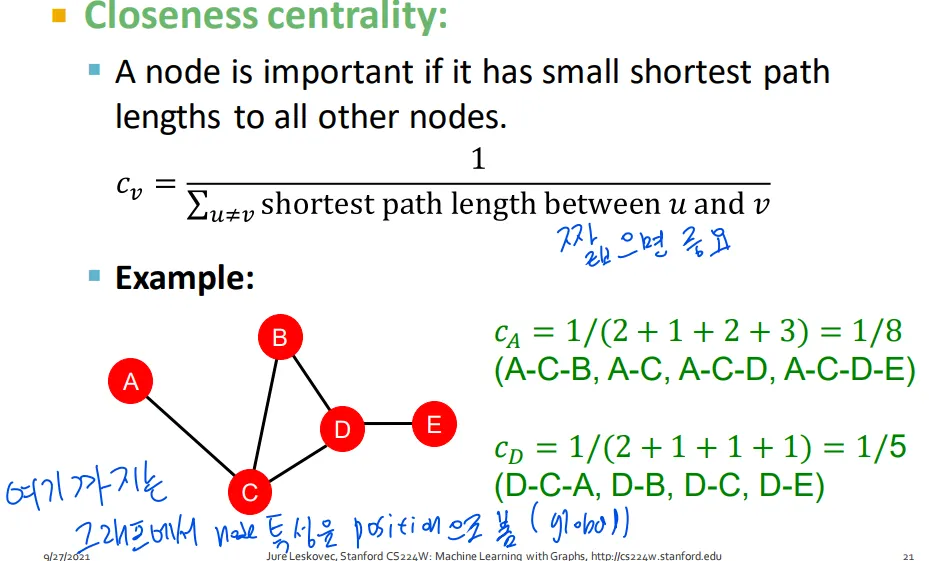 내가 다른 node랑 가까우면 closeness centrality 증가
