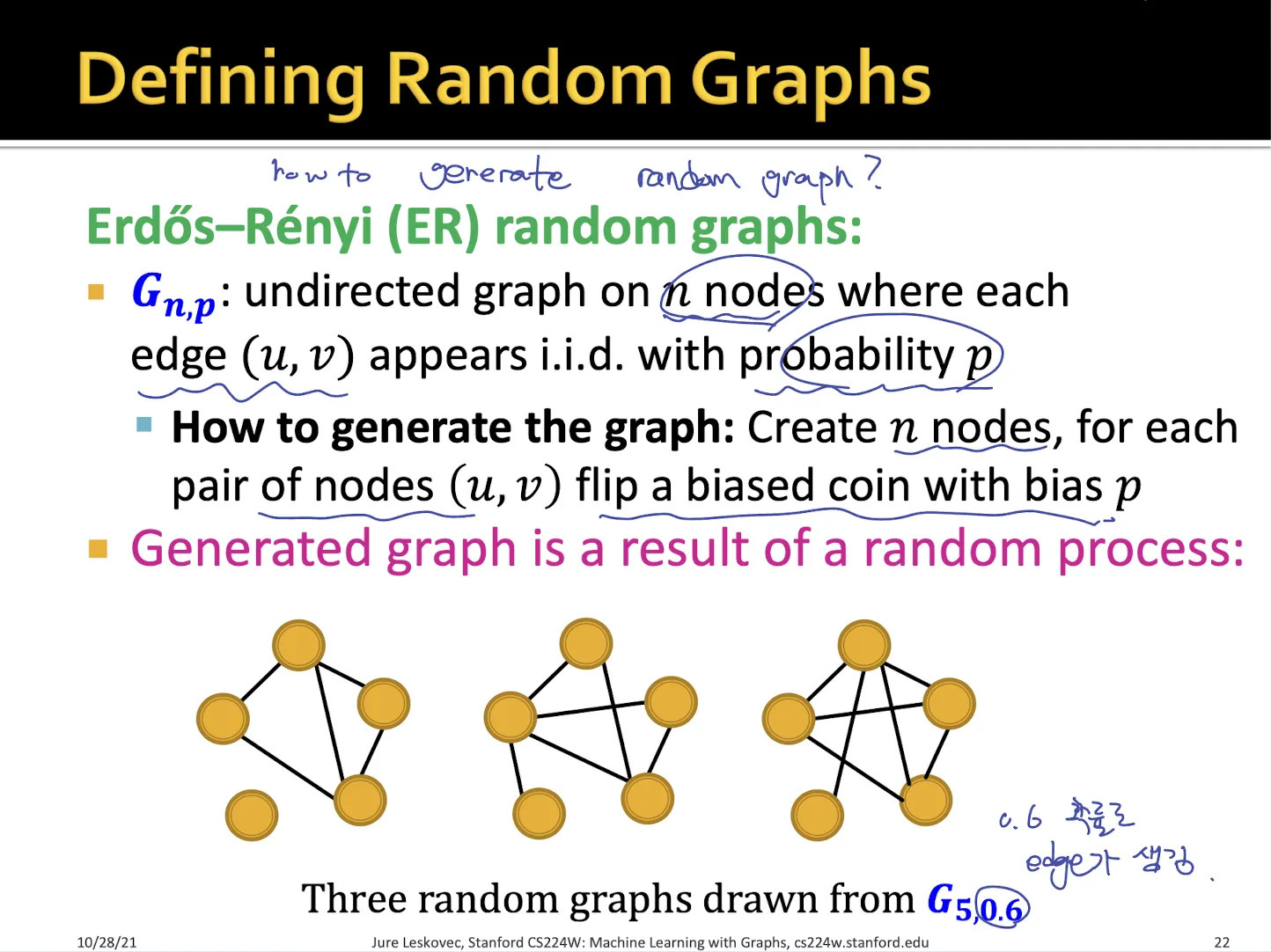 몇 개의 node가 graph에 들어가있는지 설정, 특정 확률로 node끼리의 edge가 존재