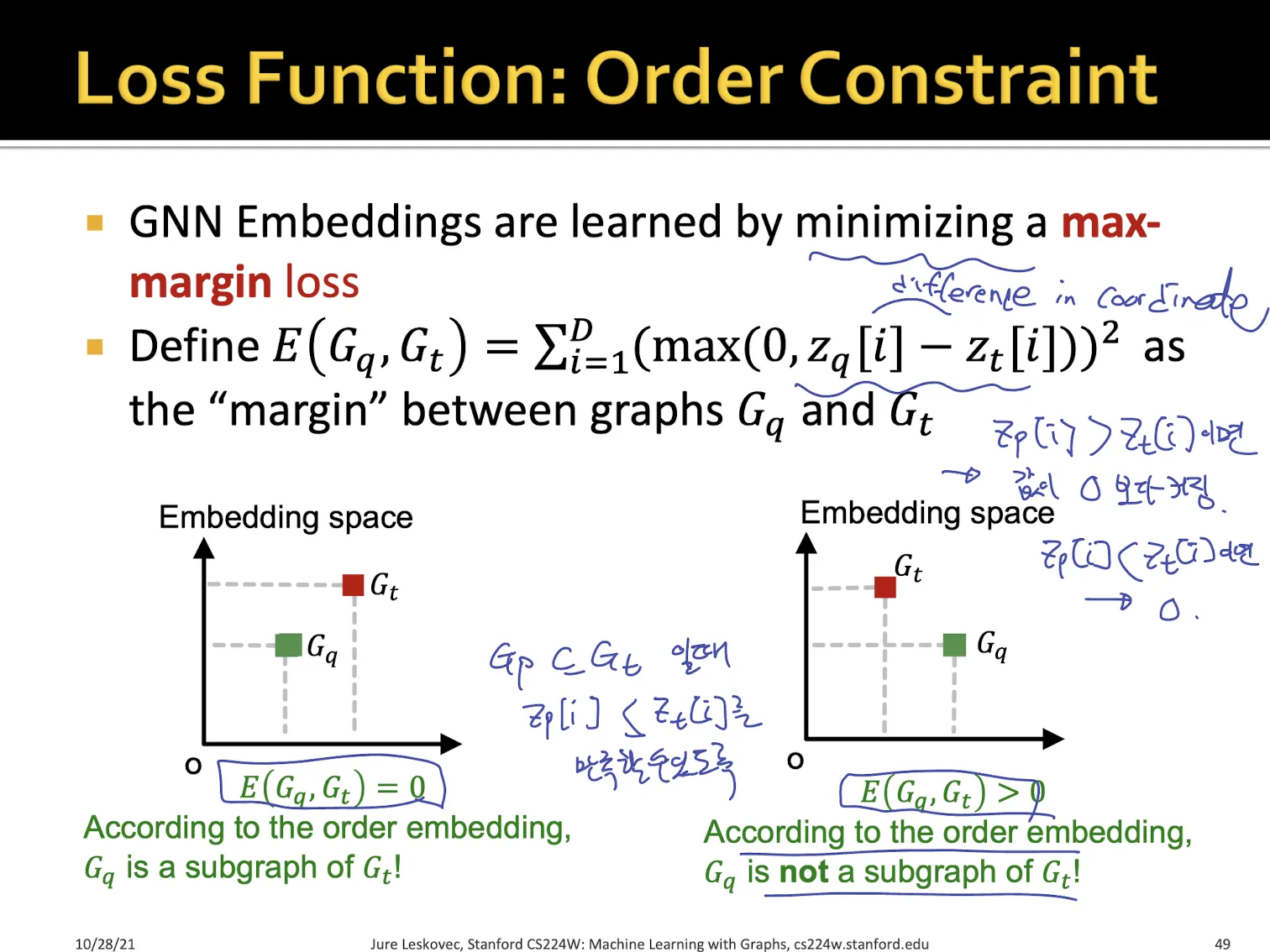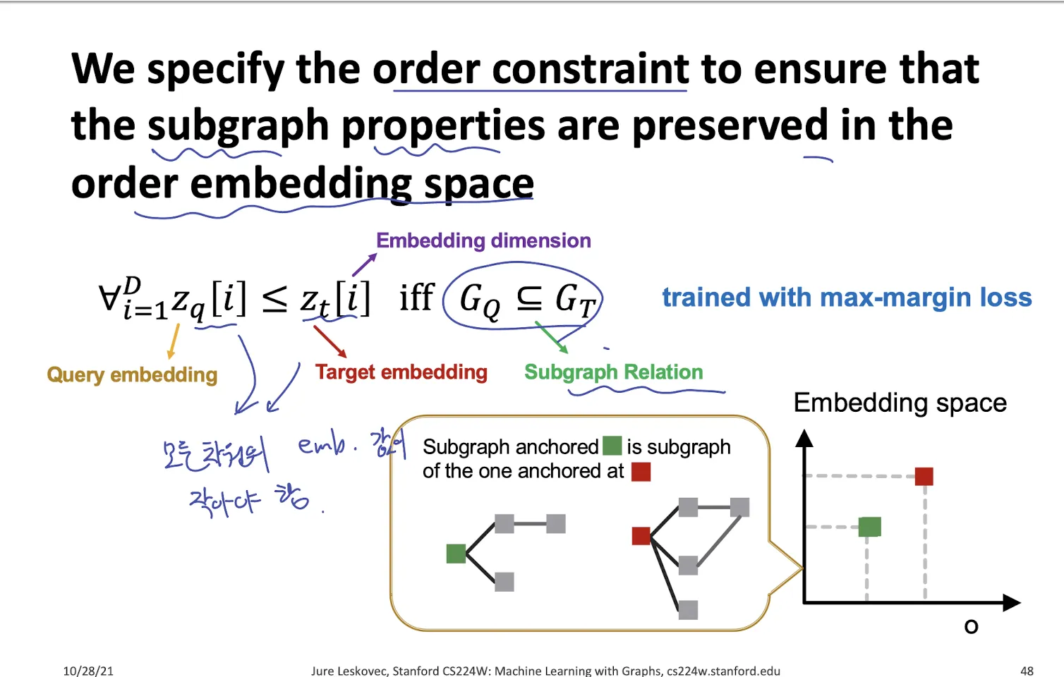 가 의 subgraph의 관계일 때 이 되도록 order embedding을 학습했다면, 이면 subgraph, 이면 subgraph가 아니라고 예측할 수 있다.