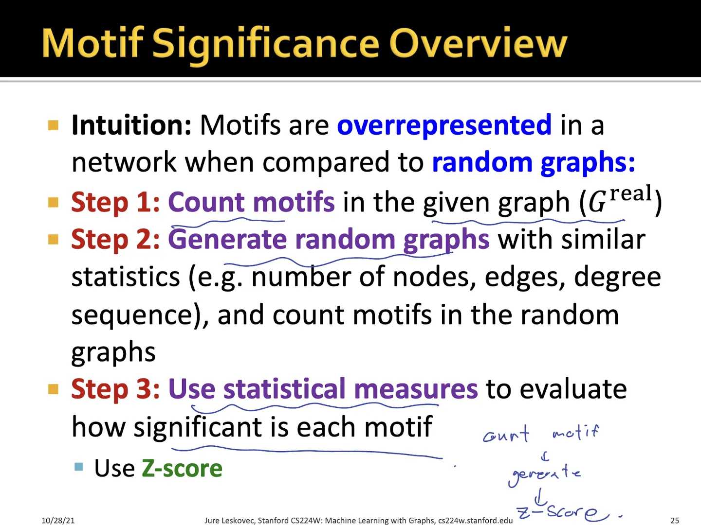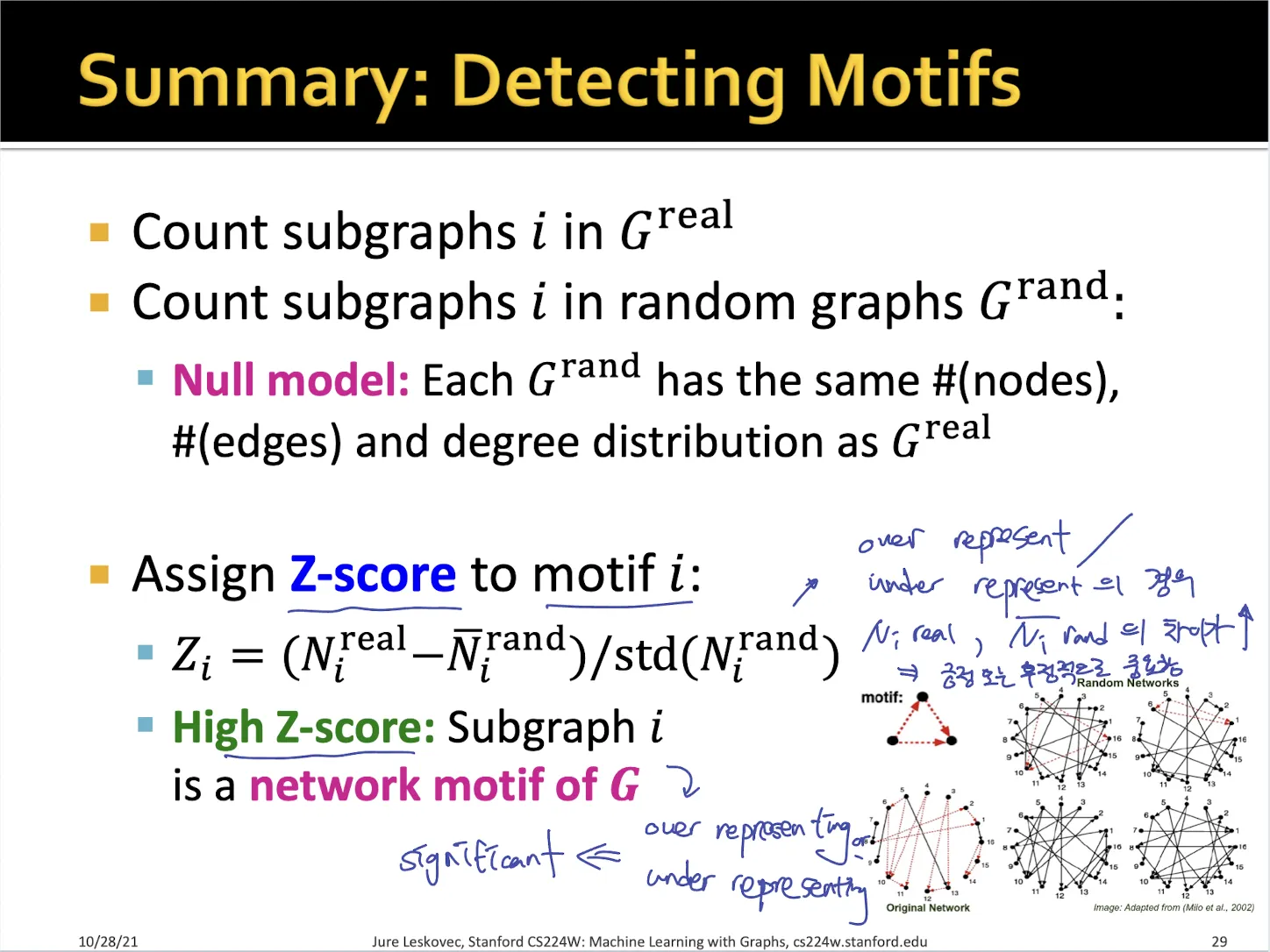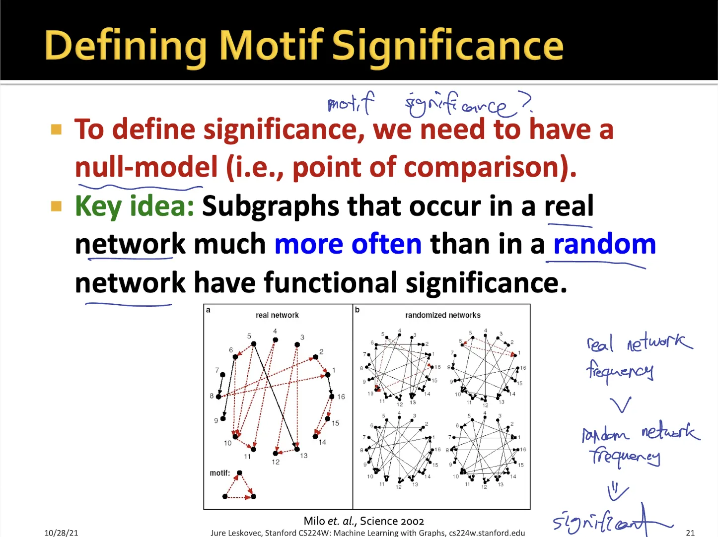 해당 motif가 real network에서 많이 등장하고 random network에서는 많이 등장하지 않는다면, 해당 motif는 real network에서 중요한 subgraph일 것이다.