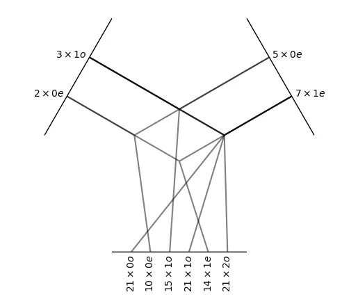 from e3nn import o3 # example tp = o3.FullTensorProduct( irreps_in1='2x0e + 3x1o', irreps_in2='5x0e + 7x1e' ) tp.visualize()