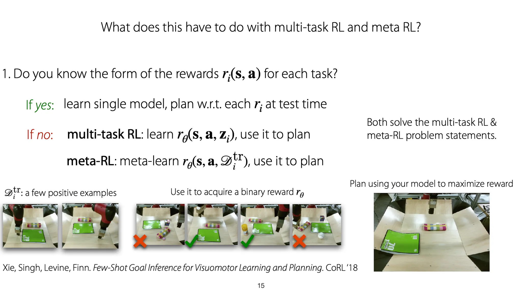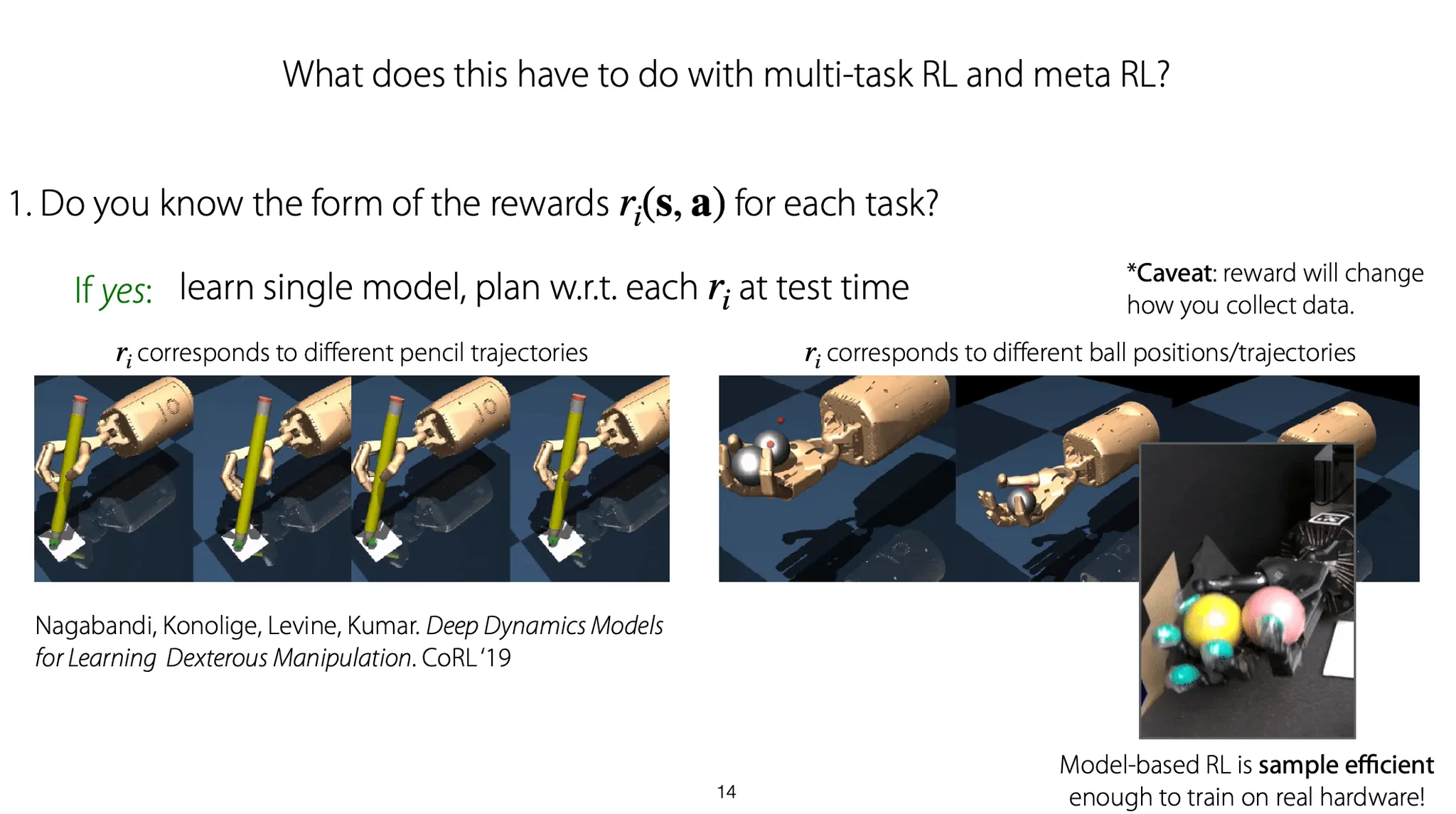 그런데 생각보다 dynamics(가 크게 다르지 않은 경우가 많다. 예를 들어 중력은 모든 물리 환경에서 동일하게 적용된다거나, 어떤 물체를 어디로 옮기든간에 물체를 집는 방식은 크게 다르지 않다. 이렇게 대부분 reward function 만 다른 경우가 많다.