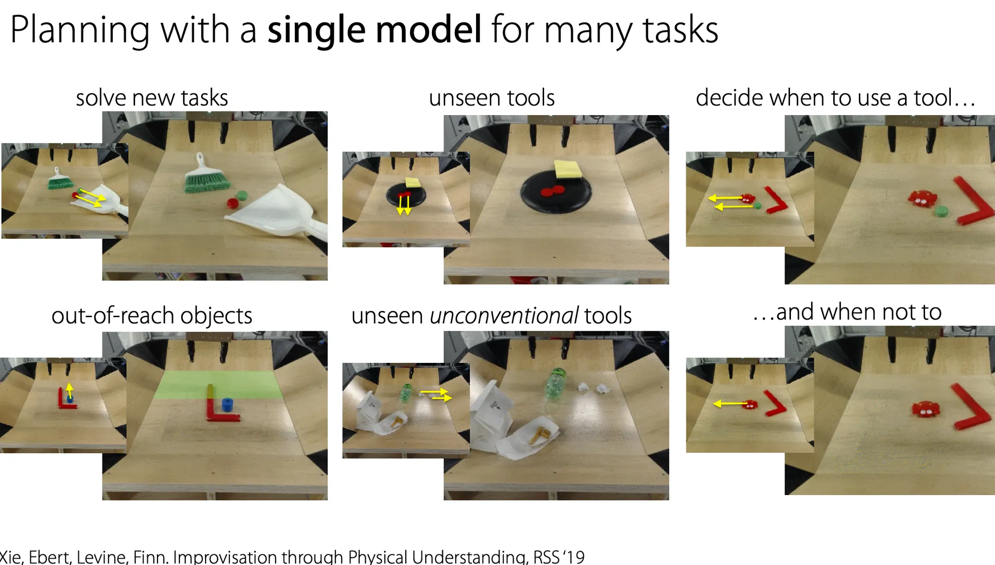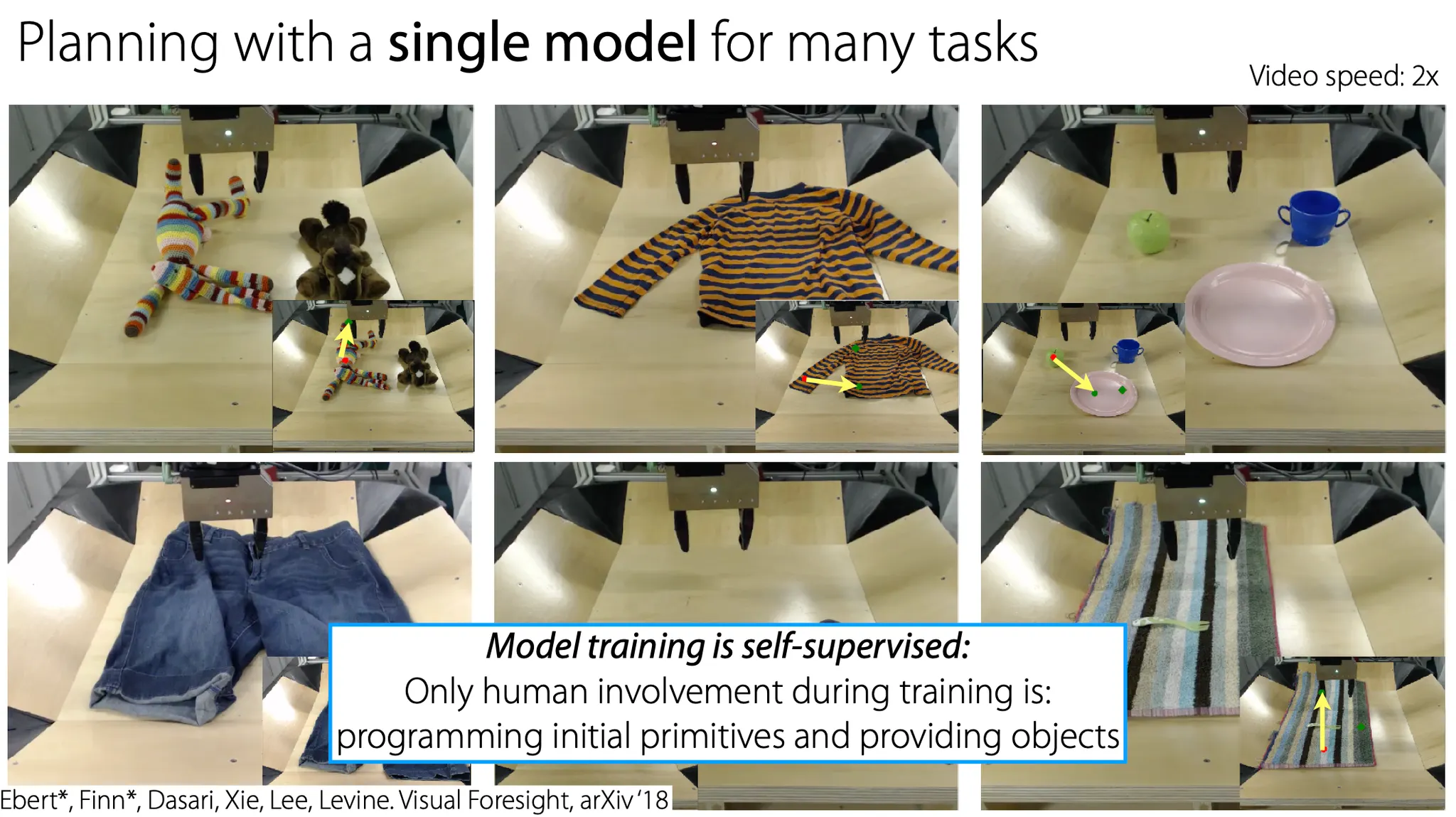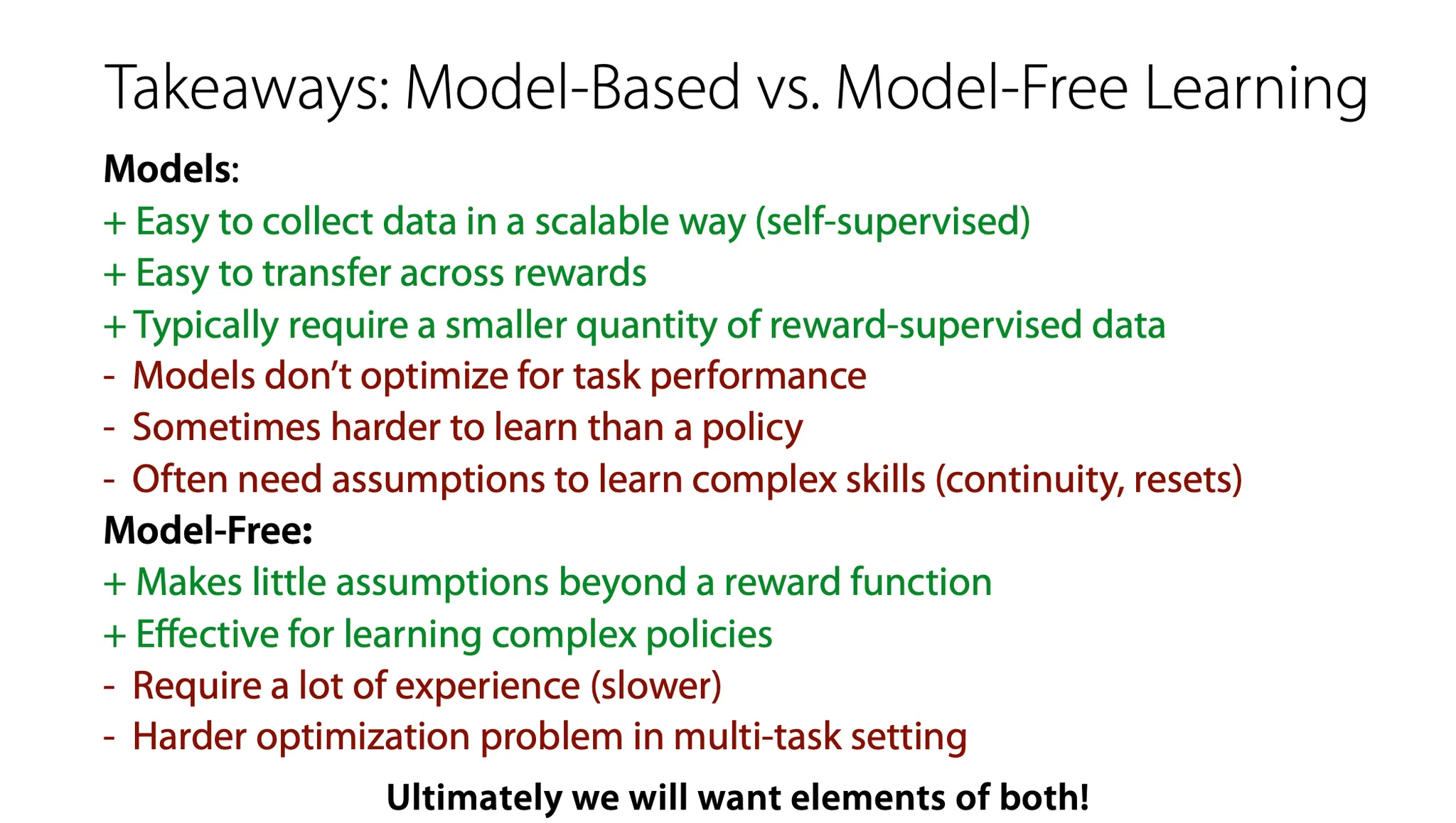 Task에 따라 dynamics를 학습하는 것과 policy를 학습하는 것 둘 중에 서로 적합한 경우가 다를 수 있다. 예를 들어, 물을 따라야 하는 task에 대해서는 물이 흐르는 dynamics를 학습하는 것보다 그냥 로봇팔로 물이 들어있는 물체를 기울이는 동작(policy)이 더 학습하기 쉬울 것이다. 이 경우는 model-free appraoch가 더 쉬울 수 있다. 반면에 특정 position으로 물체를 밀어넣으려고 한다면, 물체를 밀어넣는 dynamics는 꽤 간단해서 한 번 model을 이용해 dynamics를 학습해 놓으면 여러 task에 대해서 적용할 수 있을 것이다.