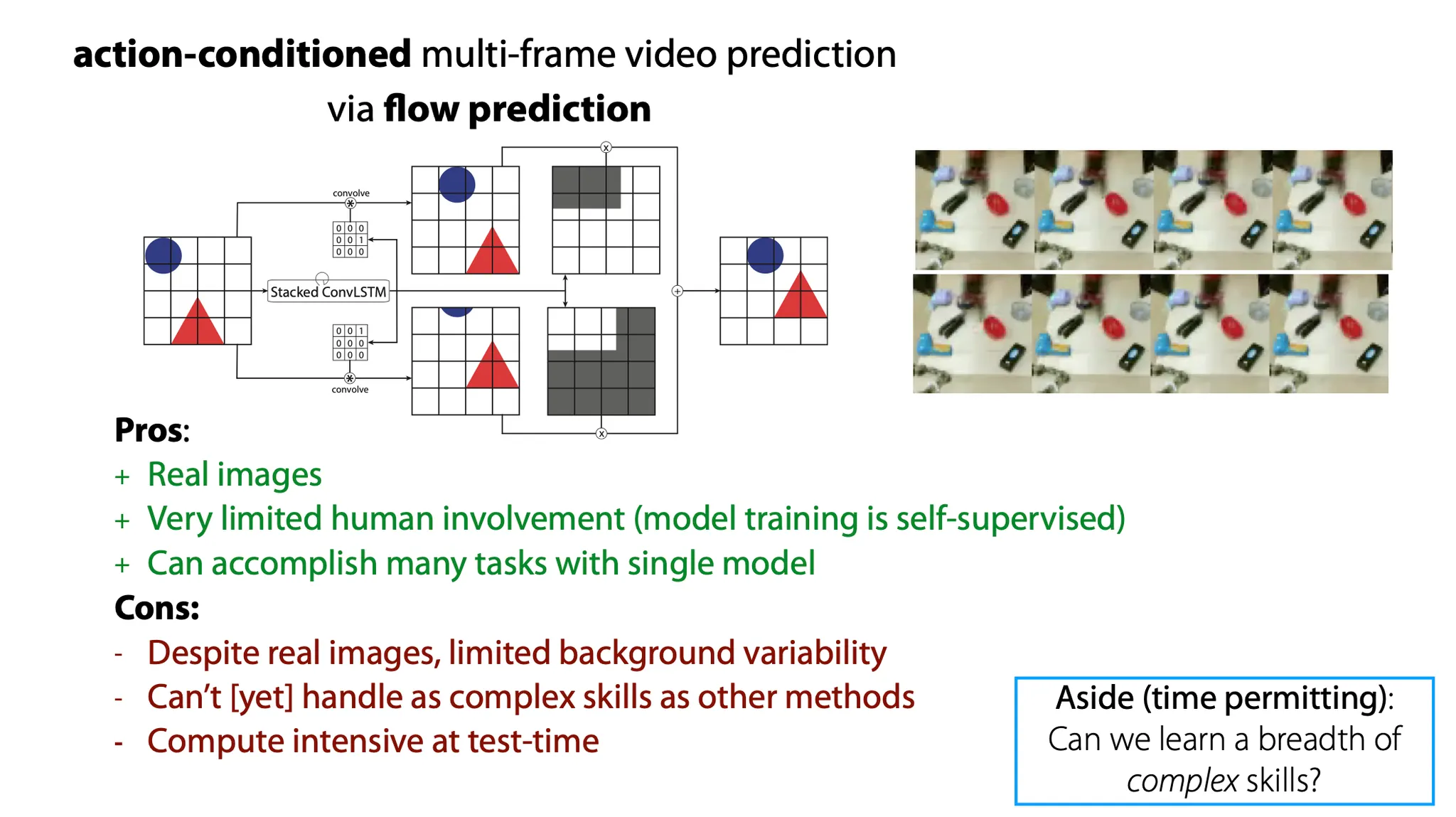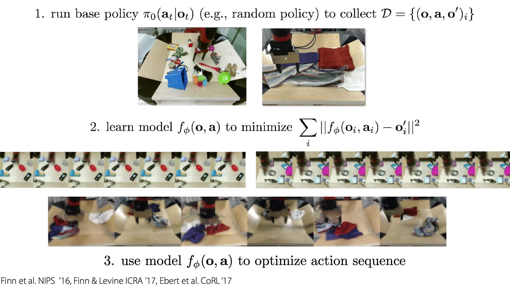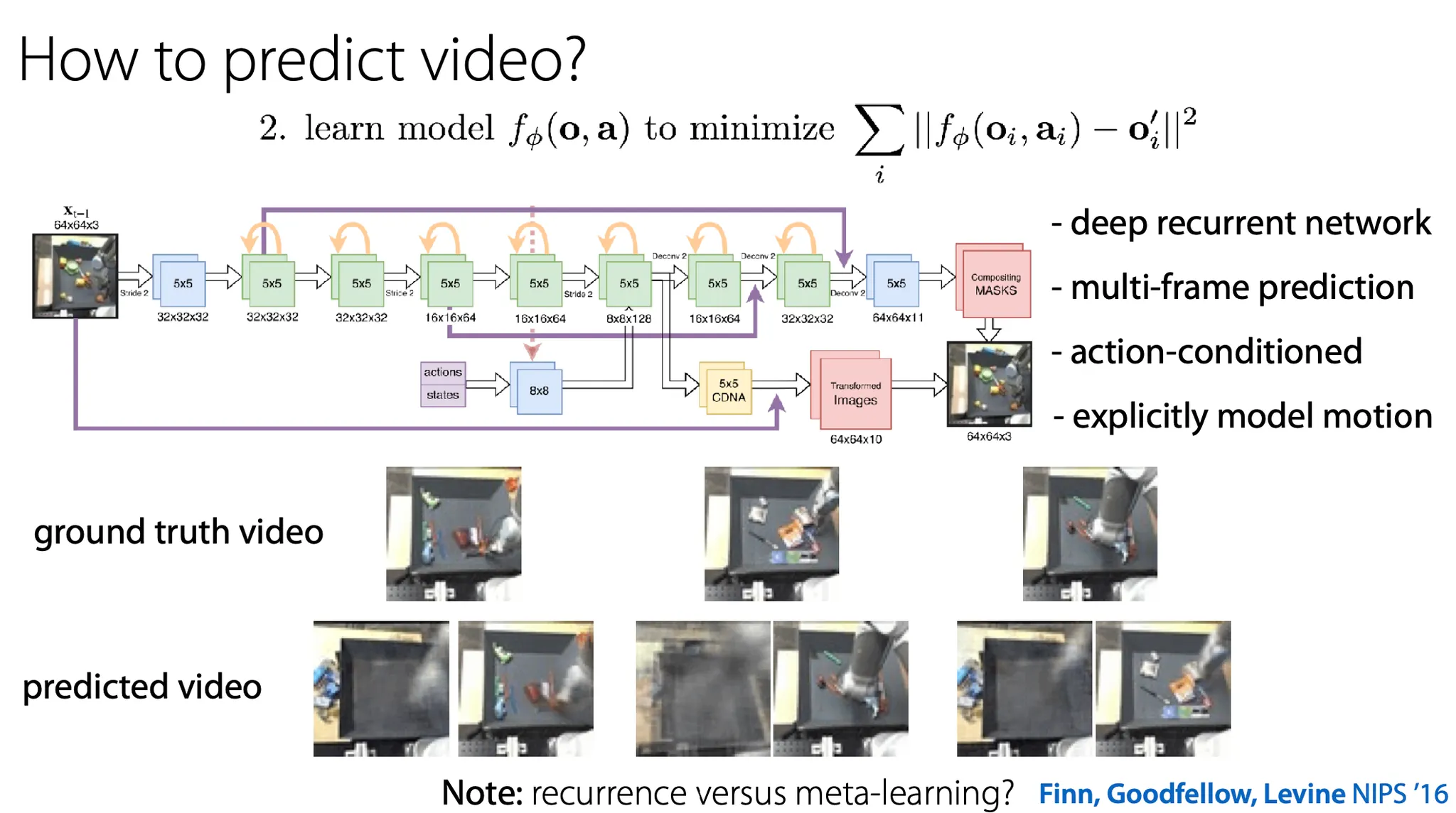 2016년에 제안된 방법으로는 deep recurrent network를 사용해 여러 frame을 예측하는 task를 수행할 때 action(및 그 state에 대한 다른 정보도 사용 가능. e.g. 로봇 팔의 위치 등)에 condition 되어 있고 motion(pixel)을 explicit하게 modeling 하는 방법이 있다.