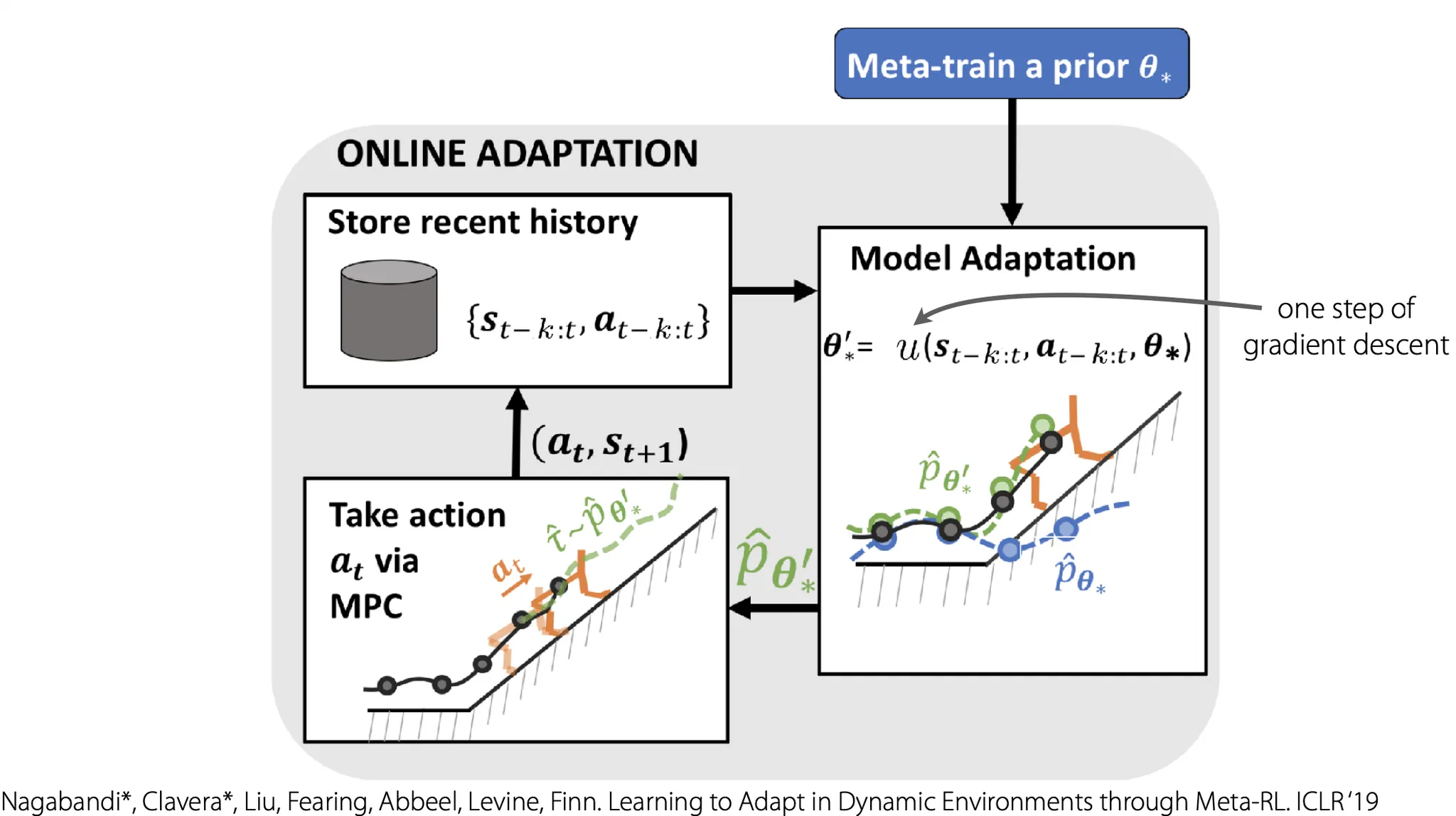 Online adaptation을 한 눈에 정리하자면, 최근 history를 저장하고, 그에 대해 adaptation을 한 뒤, 특정 action을 취하고, 그걸 다시 history에 반영한다. 이때, model 초기화를 prior 로 한다면 가 일종의 meta-knowledge가 될 것 이다.