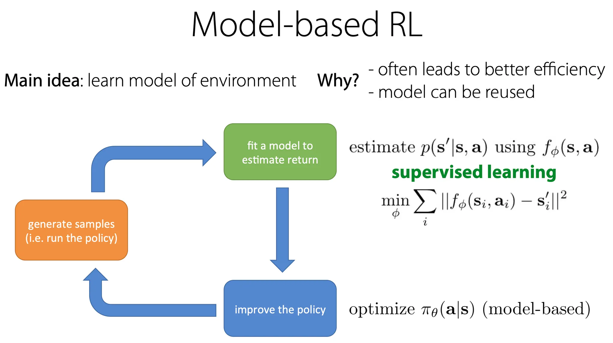 Model-based RL은 dynamics에 대한 model을 estimate 하기 위함이고, 이는 결국 environment에서 현재 state()와 action() 선택지를 이용해 다음 state()를 예측하는 일종의 supervised learning problem이 된다.