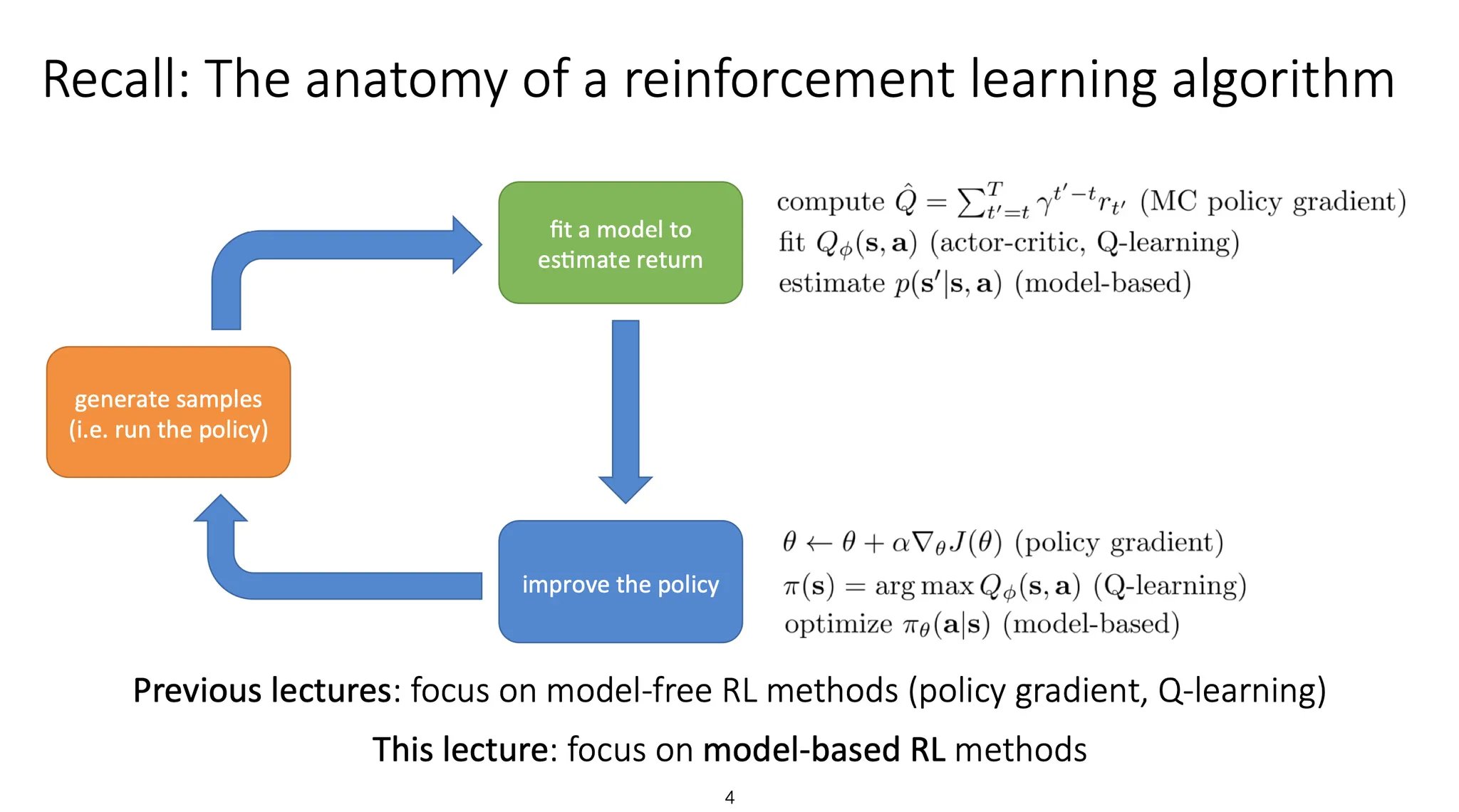이전 강의(Lecture 6)에서는 policy gradient와 Q-learning 기반의 방법들을 다뤘고, 이번 강의에서는 model-based RL을 다룬다.