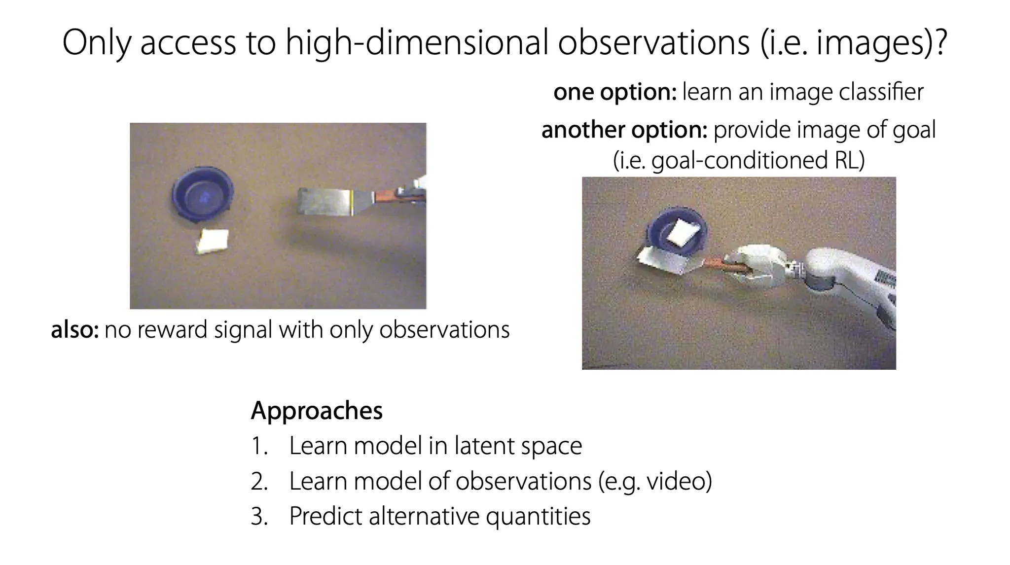Image라는 일종의 high-dimensional observation 만 주어졌을 때, 어떻게 model을 학습시킬 수 있을까? 크게 두 가지 option이 있다. 하나는 image classifer를 학습하는 것이고, 다른 하나는 goal image를 제공하는 것이다.